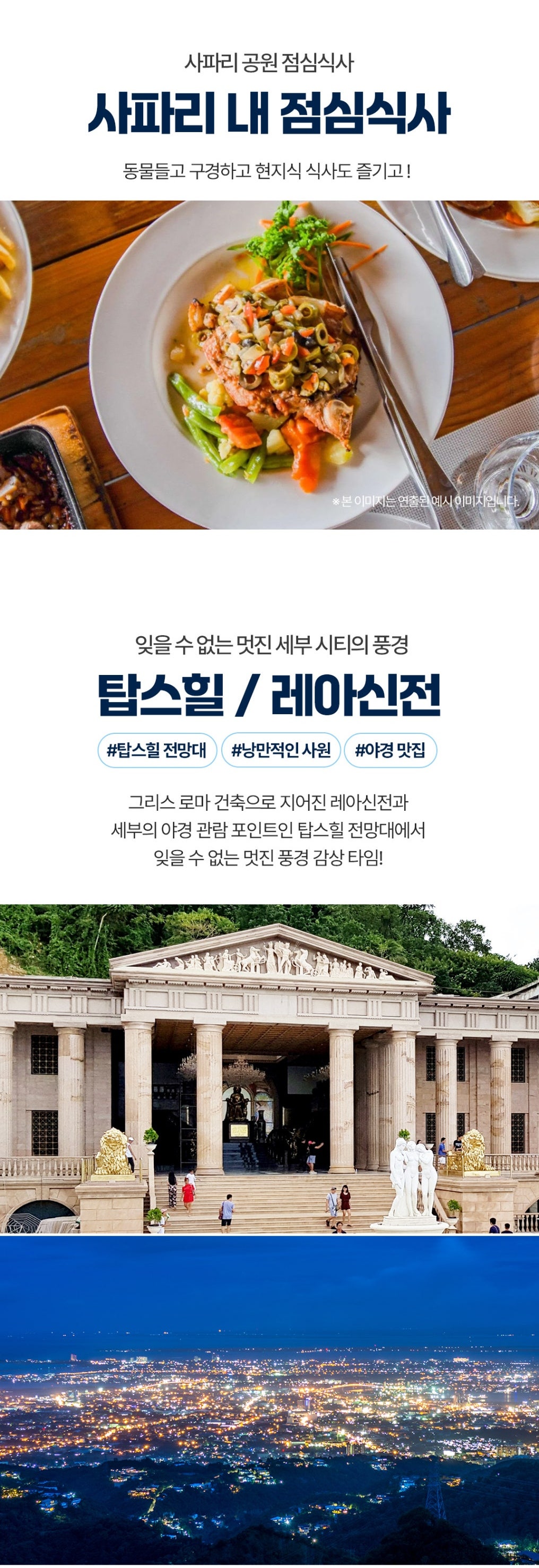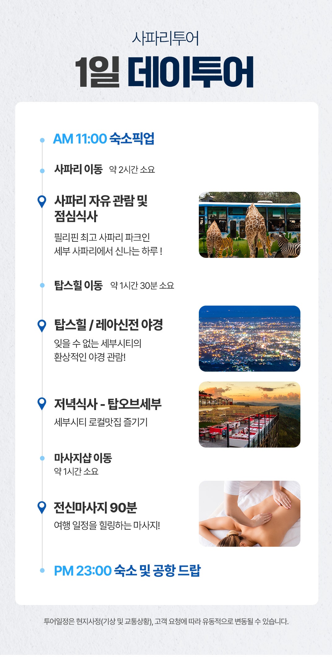 픽업(11:00) → 사파리 자유 관람 및 점심식사 → 탑스힐/레아신전 야경 → 저녁식사 → 전신마사지 90분 → 숙소 및 공항드랍(23:00)