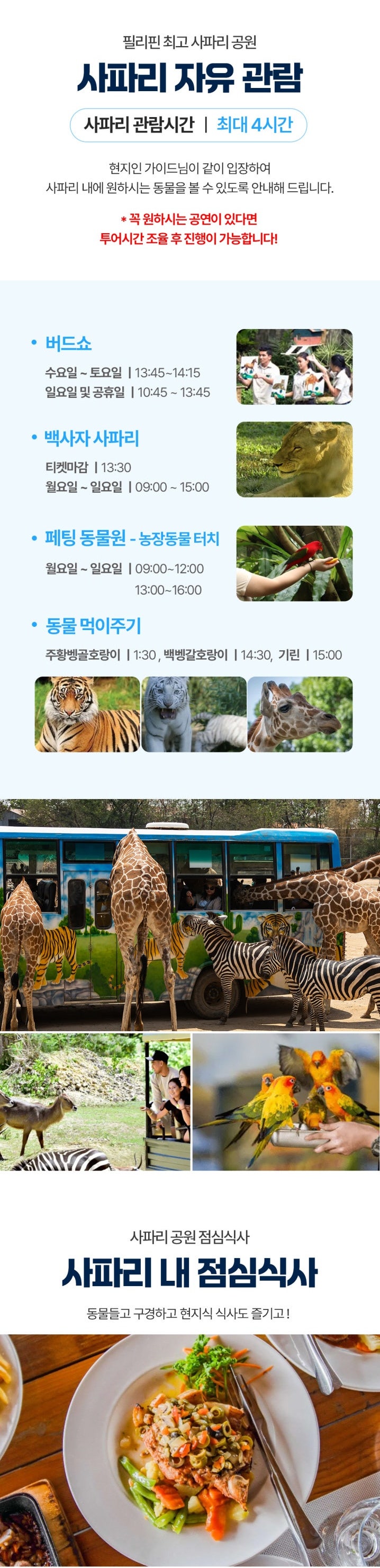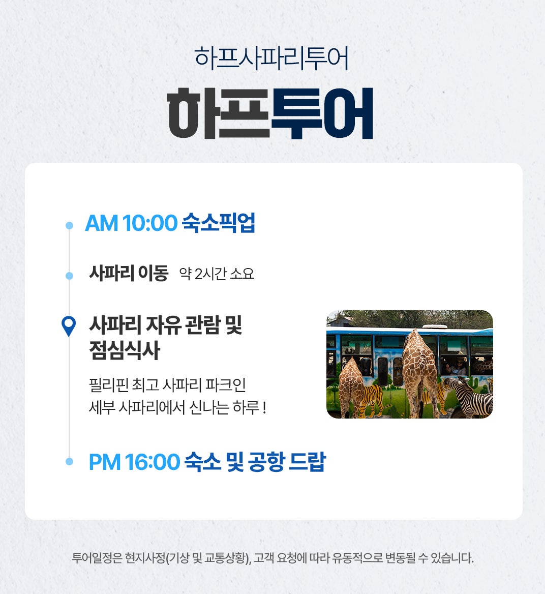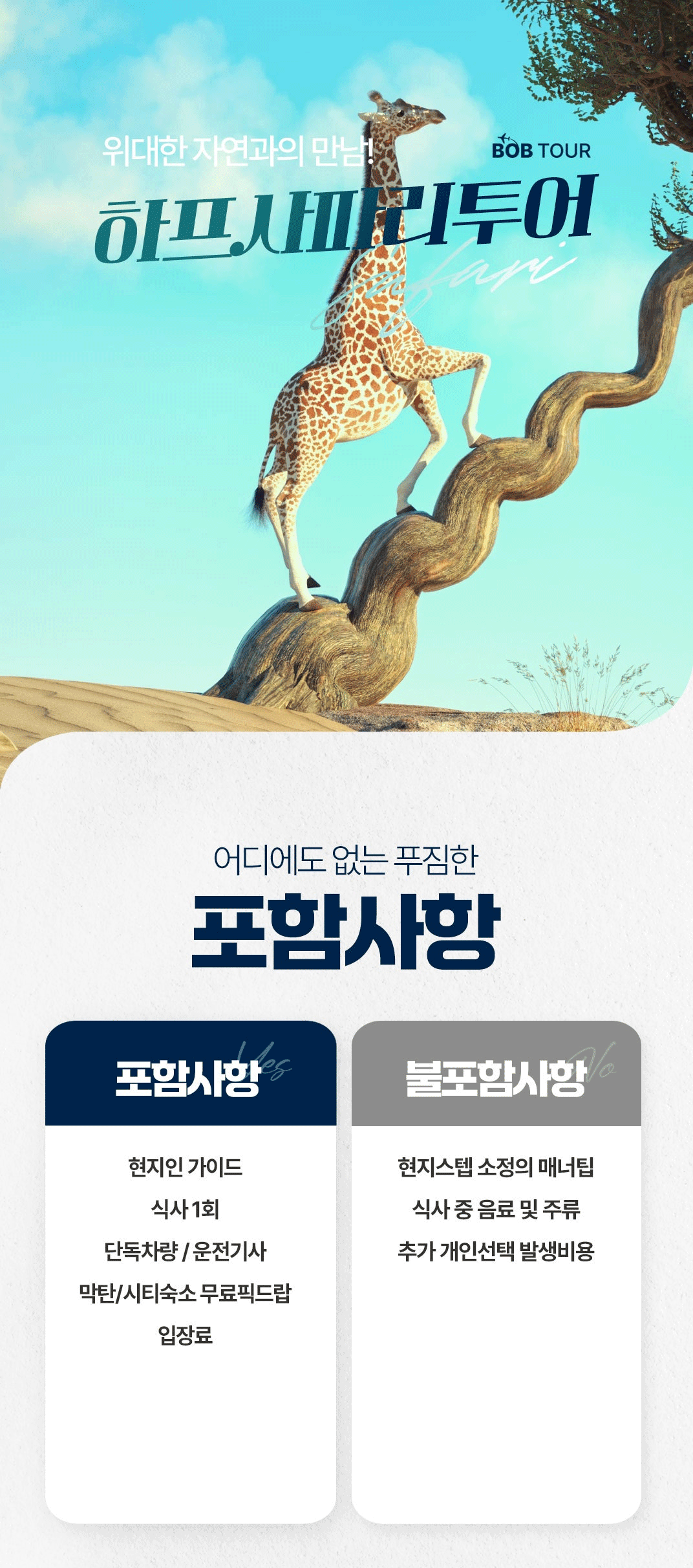 픽업(10:00) → 사파리 자유 관람 및 점심식사 → 숙소 및 공항드랍(16:00)