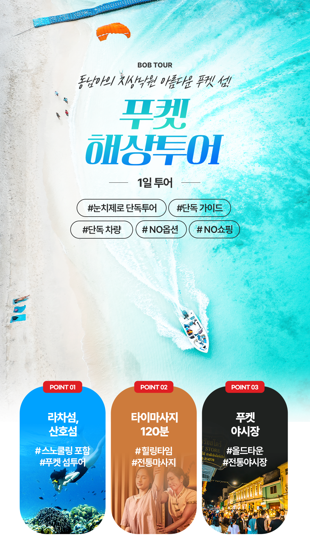 픽업(08:00) → 스피드보트 이동→라차섬+산호섬 스노쿨링→점심식사→스피드 보트 이동 복귀→타이마사지 2시간→저녁식사→푸켓 로컬 야시장→숙소드랍