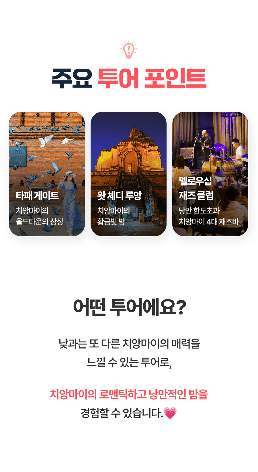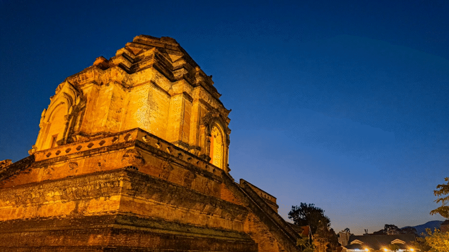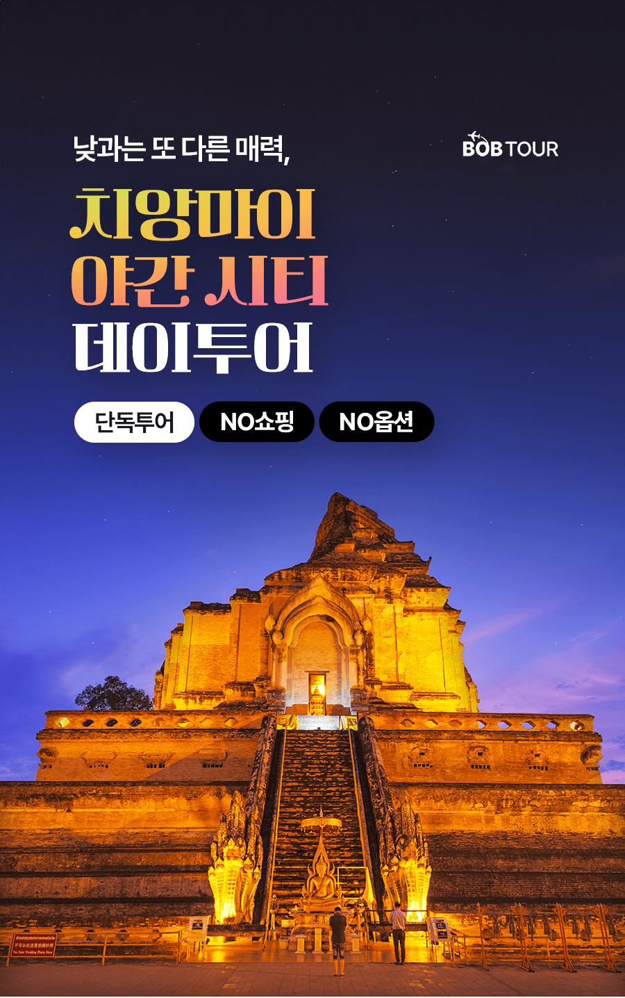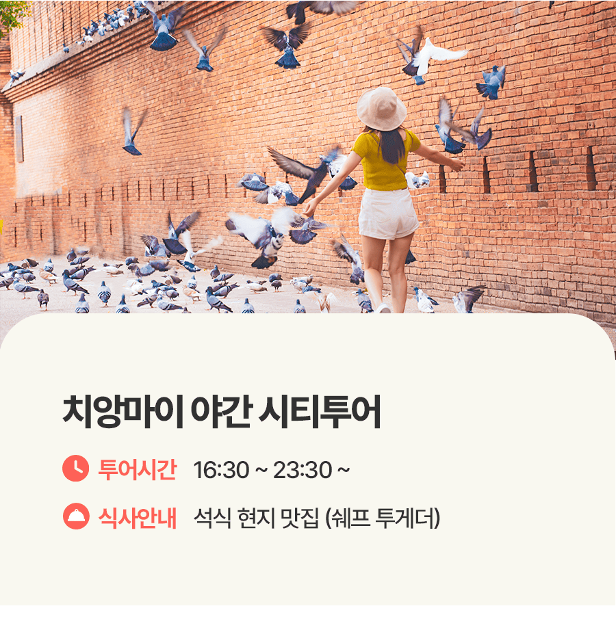픽업(16:30) → 타패 게이트 방문 → 석식 → 왓 체디 루앙 야경 → 맬로우십 재즈클럽 → 루프탑 야경 감상 → 숙소드랍