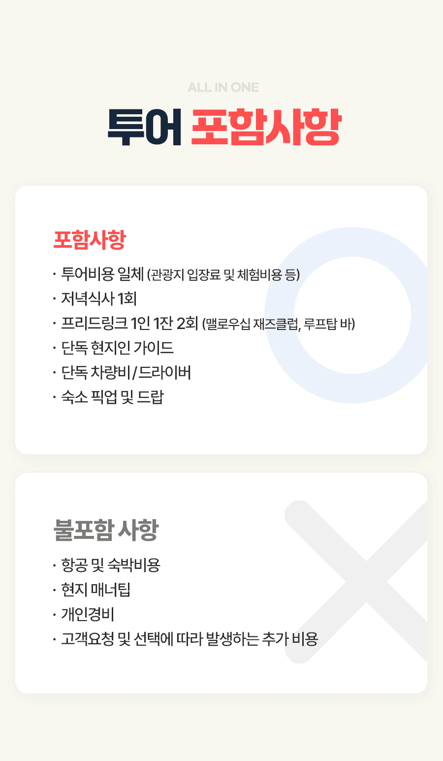 - 투어비용 일체(관광지 입장료 및 체험비용)