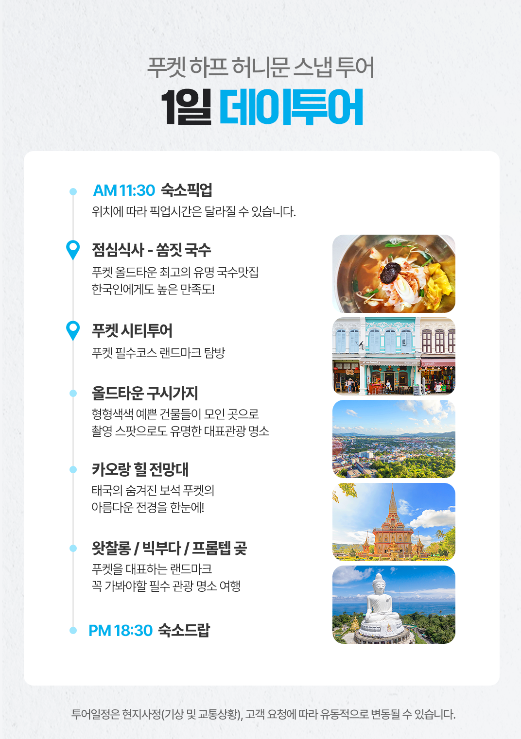 픽업(11:30) → 점심식사 →푸켓 시티투어→올드타운 구시가지→카오랑 힐 전망대→왓찰롱/빅부다/프롬텝 곶→숙소드랍