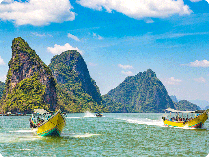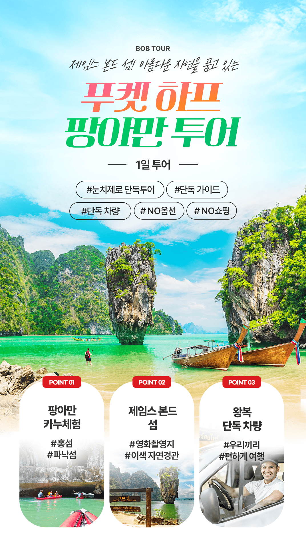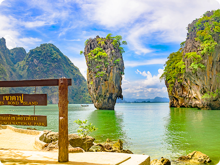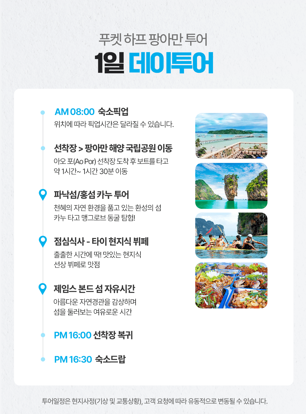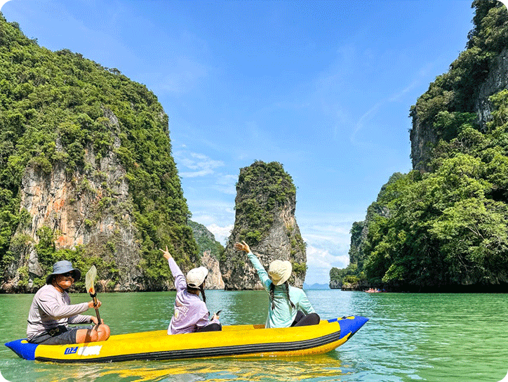 픽업(08:00) → 선착장>팡아만 해양 국립 공원 이동 → 파낙섬/홍섬 카누 투어→ 점심식사(현지식) → 제임스본드 섬 자유시간 →선착장 복귀(16:00)→ 숙소 드랍