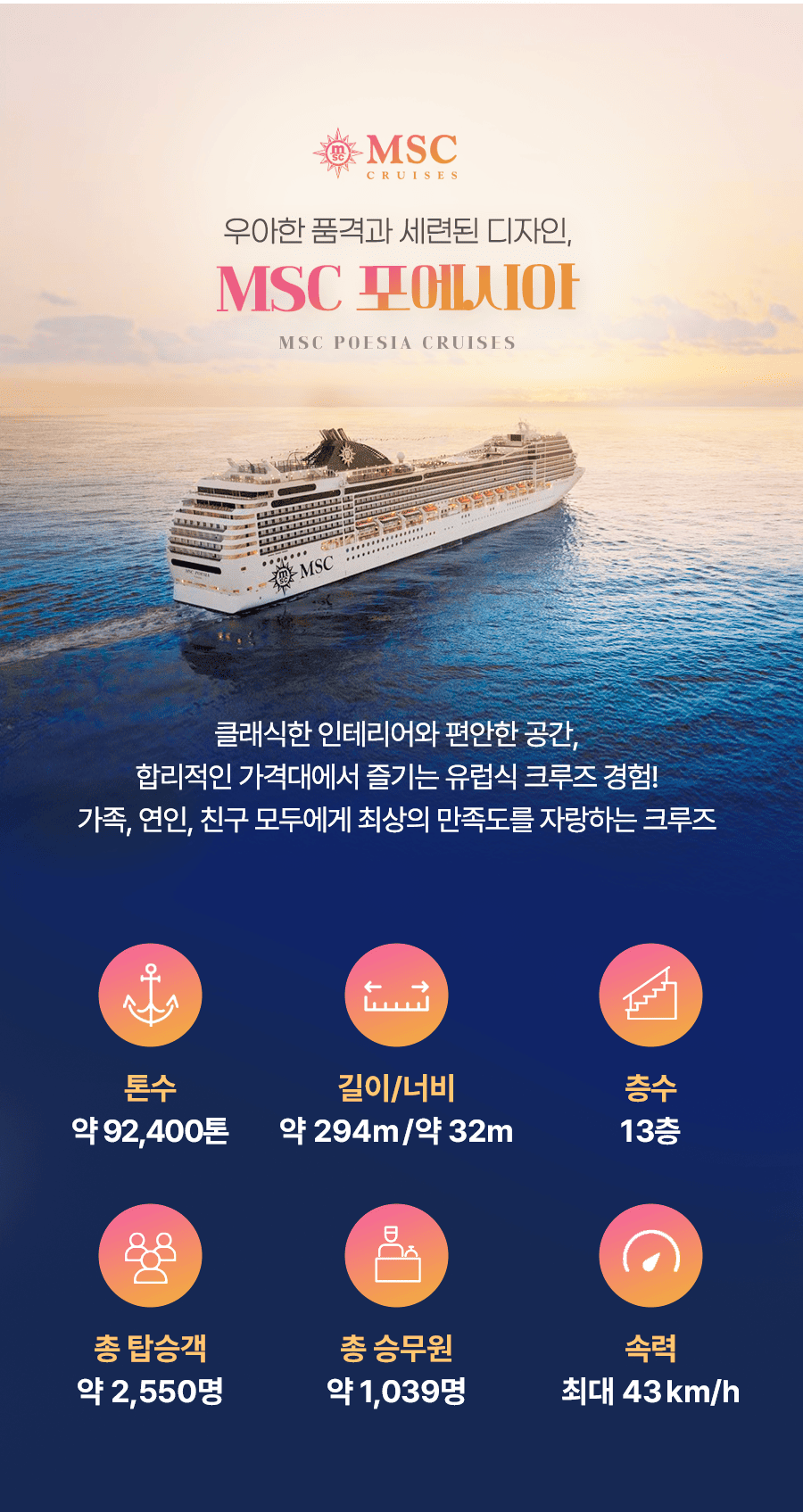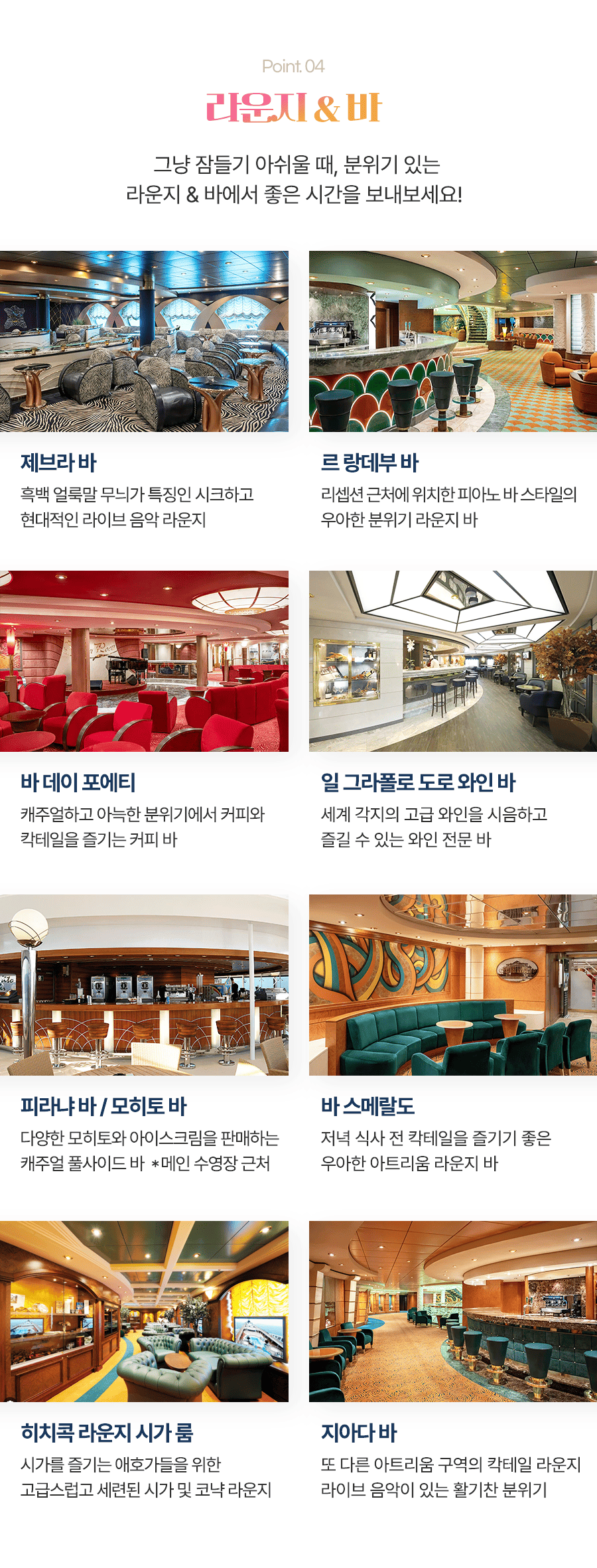 휴식을 취하면서 크루즈 시설들을 여유롭게 즐겨보시길 바랍니다.