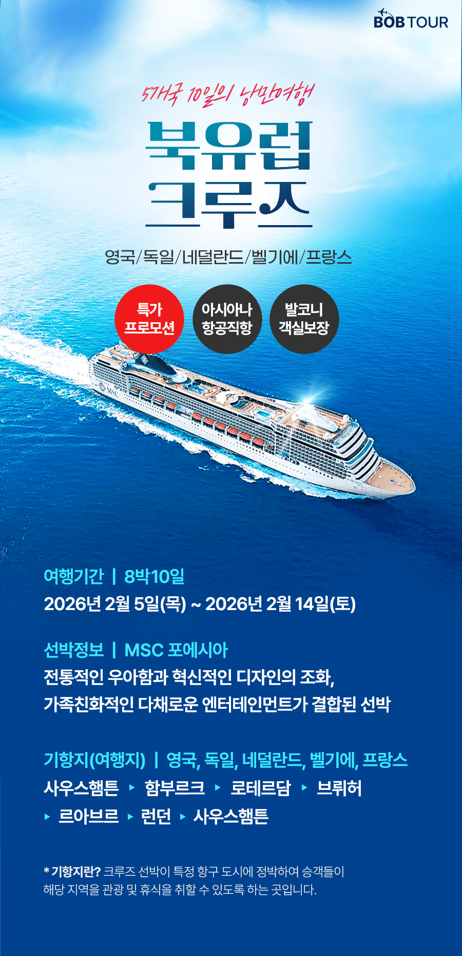 * 상기 일정은 현지 사정 또는 크루즈 선사의 일정에 따라 변경될 수 있습니다.