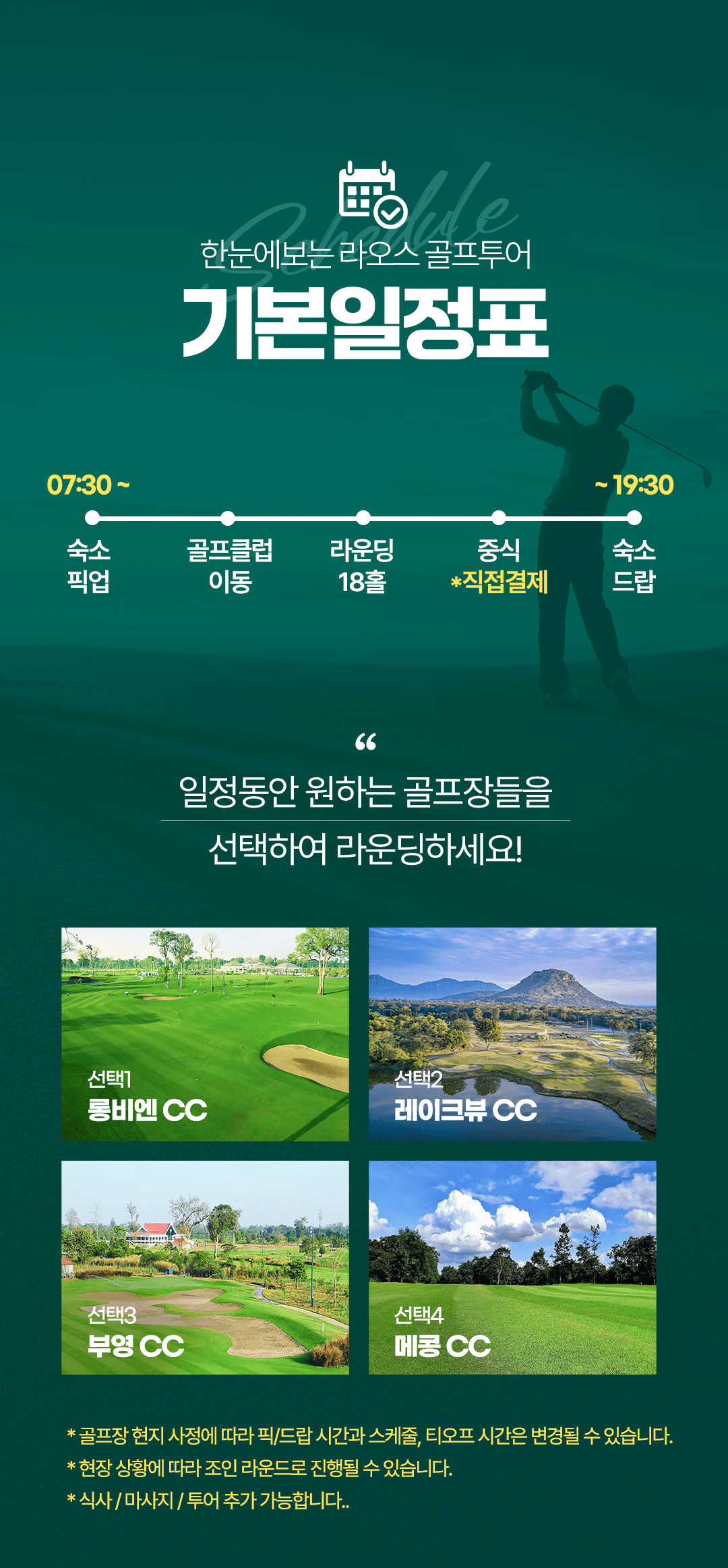 픽업(07:30) → 골프클럽 이동 → 라운딩 18홀 → 중식(클럽식) → 숙소 드랍(~19:30)