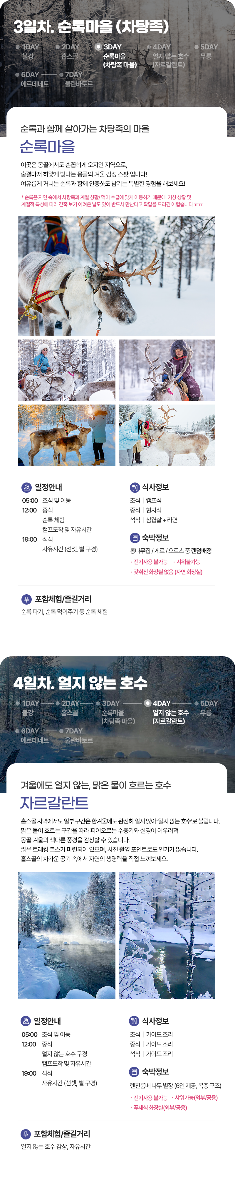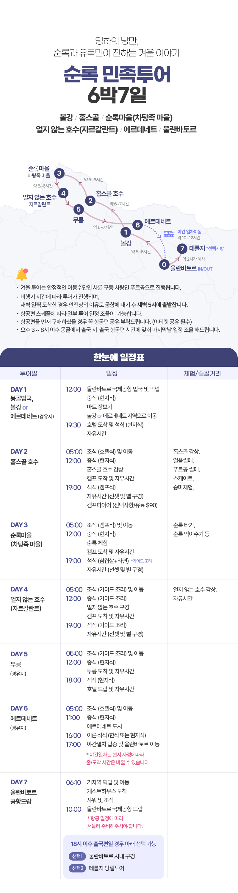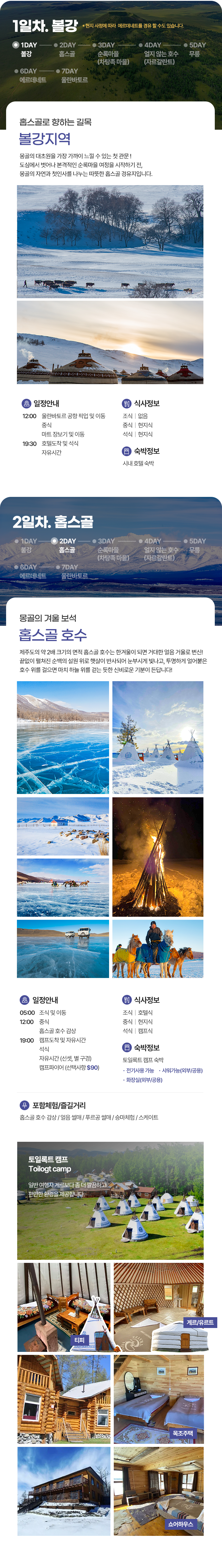 조식 및 이동(05:00) → 중식(현지식) → 홉수골 즐기기(얼음썰매, 승마체험 등) → 캠프도착 및 자유시간 → 석식(캠프식) → 자유시간 (선셋 및 별구경)