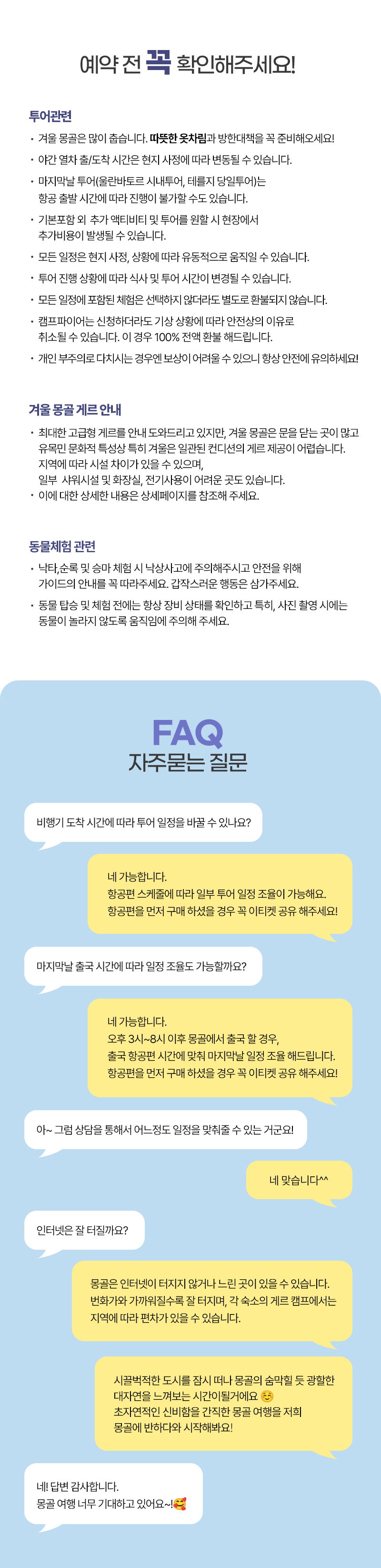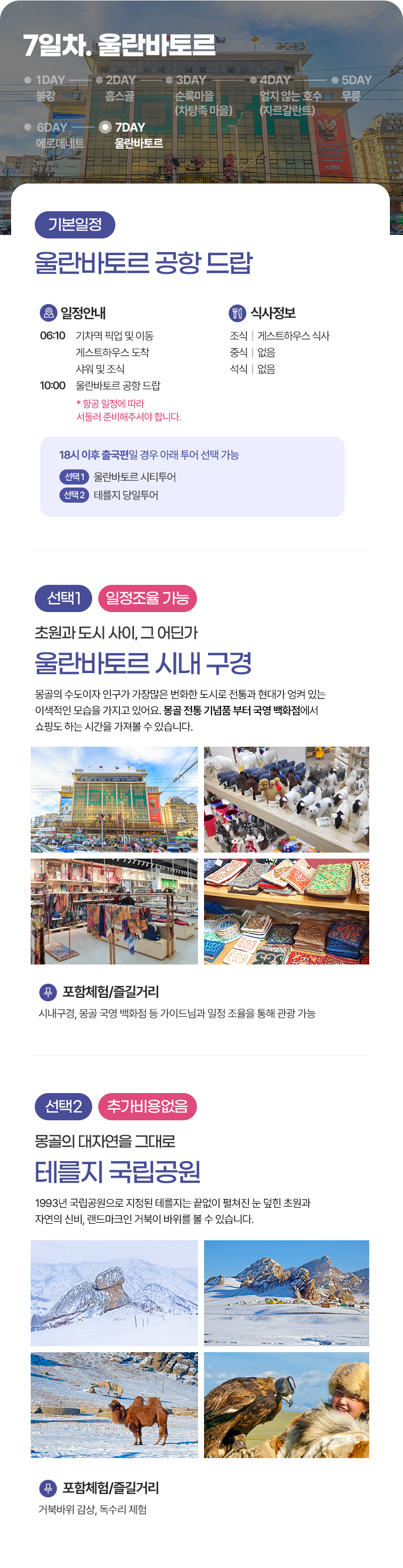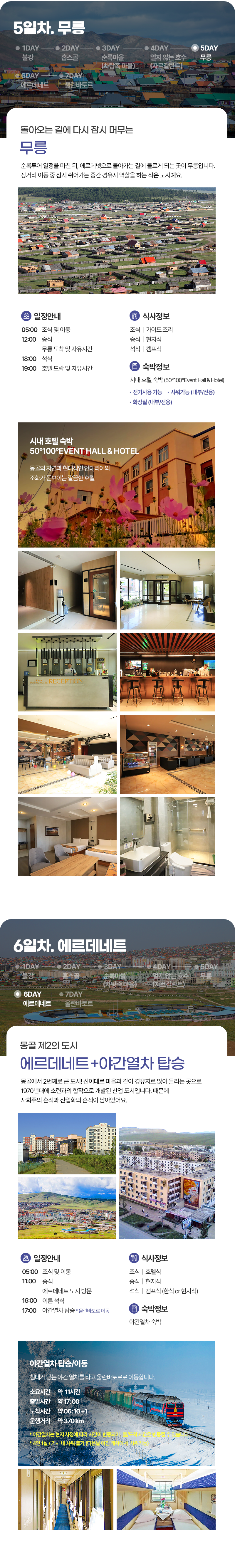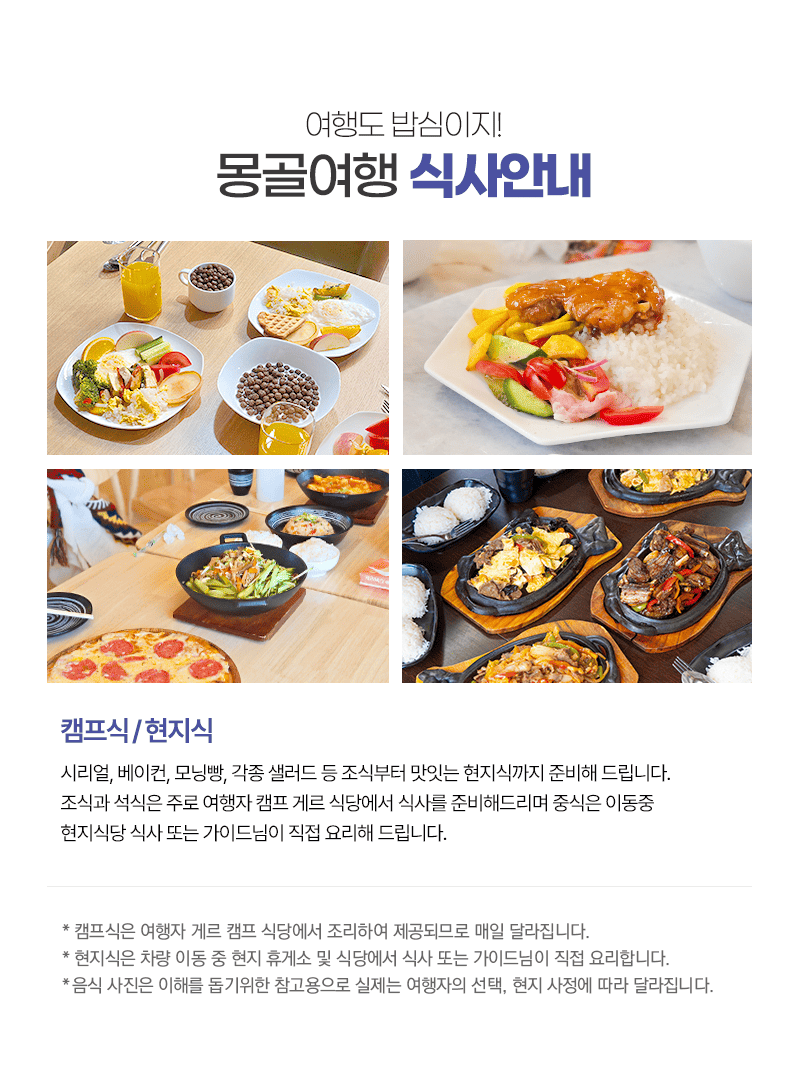 조식 및 이동(05:00) → 중식(현지식) → 홉수골 즐기기(얼음썰매, 승마체험 등) → 캠프도착 및 자유시간 → 석식(캠프식) → 자유시간 (선셋 및 별구경)