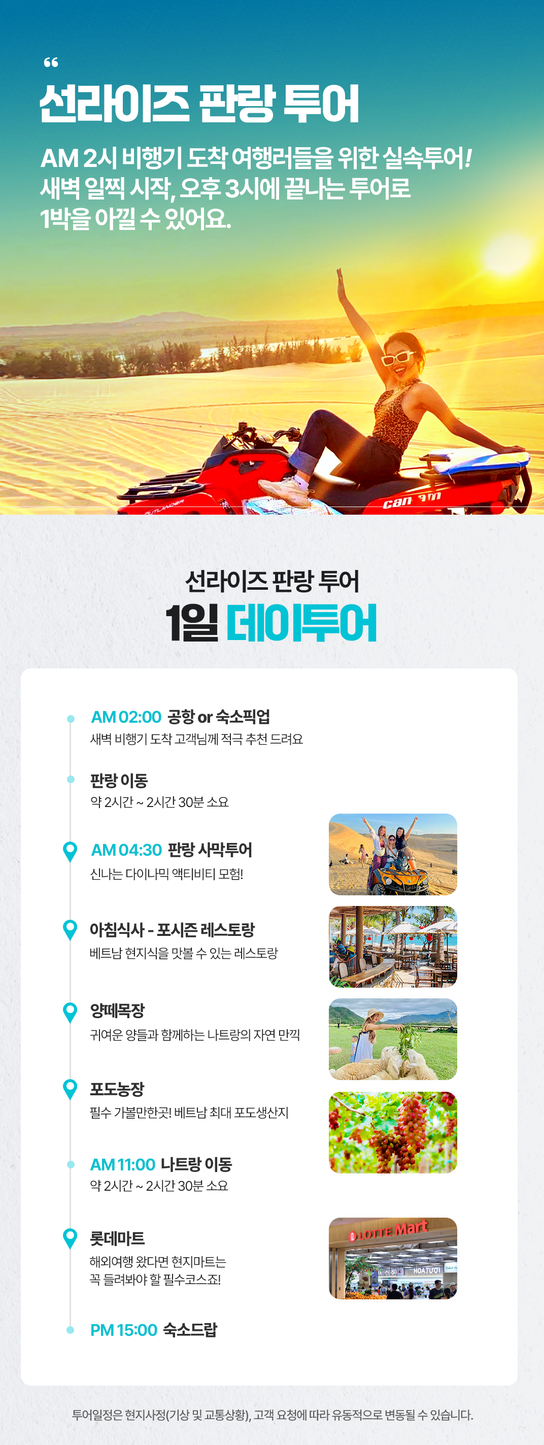 2:00픽업 →2:00~4:30판랑 이동→4:30~5:30판랑사막투어→7:00~8:30조식(포시즌레스토랑)→8:30~11:00양떼목장 및 포도농장11:00~15:00→나트랑 이동 및 롯데마트 쇼핑15:00→리조트 드랍