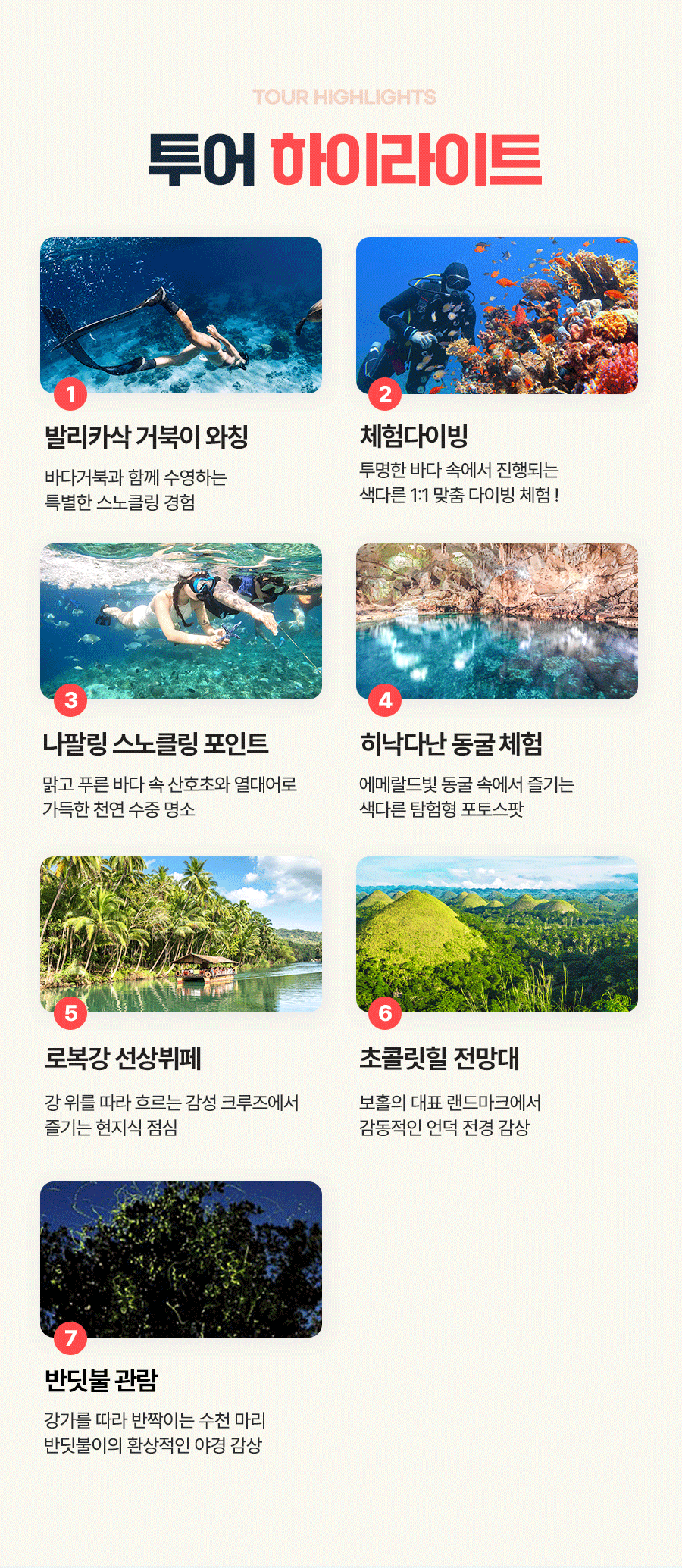 픽업(11:00) → 로복강 선상뷔페 점심식사 → 뱀,나비농장 → 맨메이드 → 안경원숭이 → 초콜릿힐 → 반딧불 관람 → 석식 → 90분전신마사지 → 공항 혹은 리조트 드랍