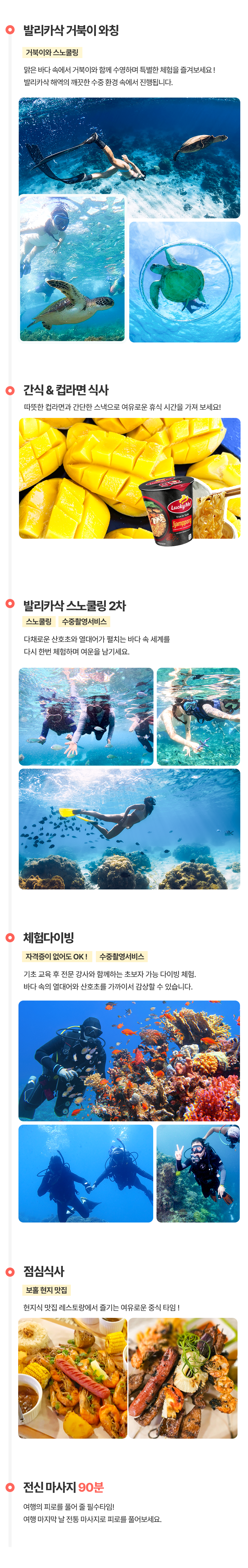 픽업(09:00) → 발리카삭 거북이와칭 → 간식시간 → 발리카삭 스노클링2차 → 선착장복귀 → 체험다이빙 → 중식 → 90분 전신마사지 → 투어 종료 시 드랍