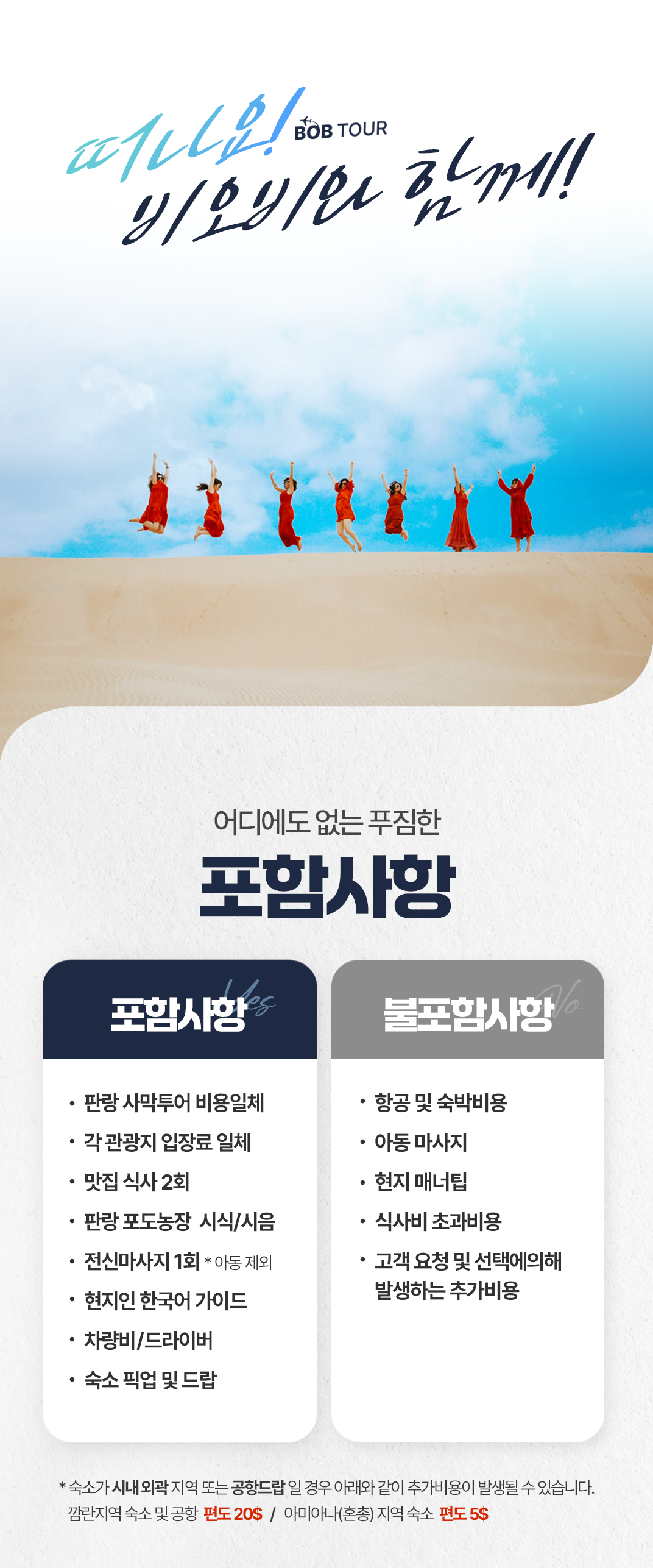 8:00 픽업 → 양떼목장 및 포도농장(10:00~12:00) → 중식(포시즌레스토랑, 12:00~13:00) → 판랑사막투어 및 추가요청 투어(13:00~15:00) → 90분 전신마사지(18:00~20:00) → 석식(엇히엠, 20:00~21:00) → 21:00 리조트 드랍