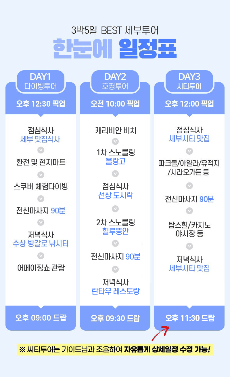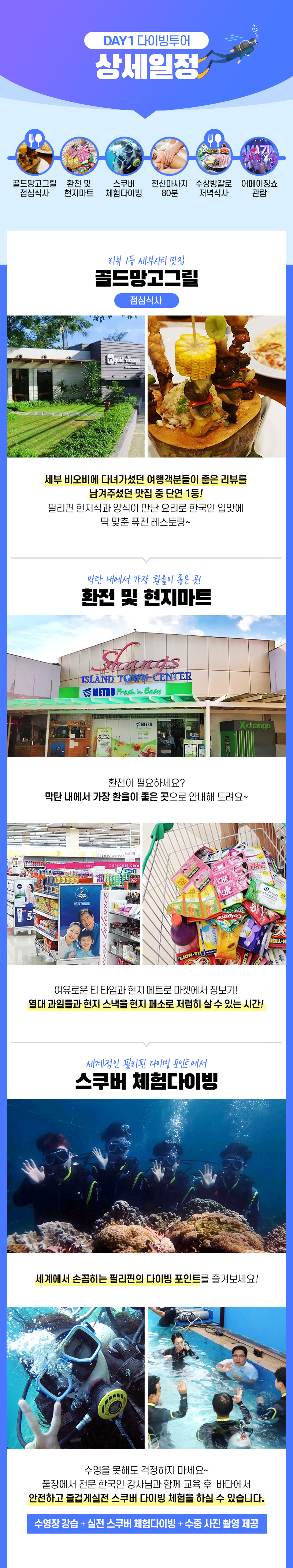 픽업(12:30) → 점심식사 → 환전 및 현지마트 → 스쿠버 체험다이빙 → 전신마사지 90분 → 저녁식사 → 어메이징쇼 관람 → 드랍(21:00)