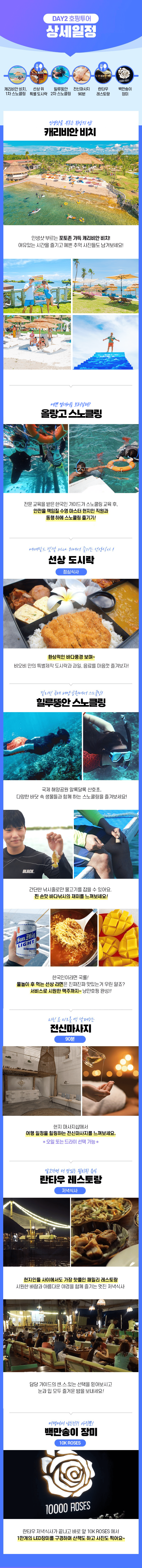 픽업(10:00) → 1차 스노쿨링(날루수안) → 점심식사 → 2차 스노쿨링(힐루뚱안) → 전신마사지 90분 → 저녁식사 → 드랍(21:30)