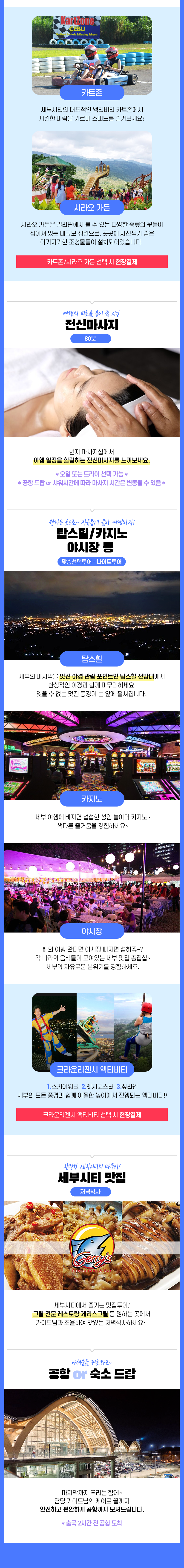 픽업(12:00) → 점심식사 → [맞춤선택투어1] 파크몰/아얄라몰/유적지/시라오가든 등 →전신마사지 90분 → [맞춤선택투어2] 탑스힐/카지노/야시장 등 →저녁식사 → 공항 드랍(23:30)