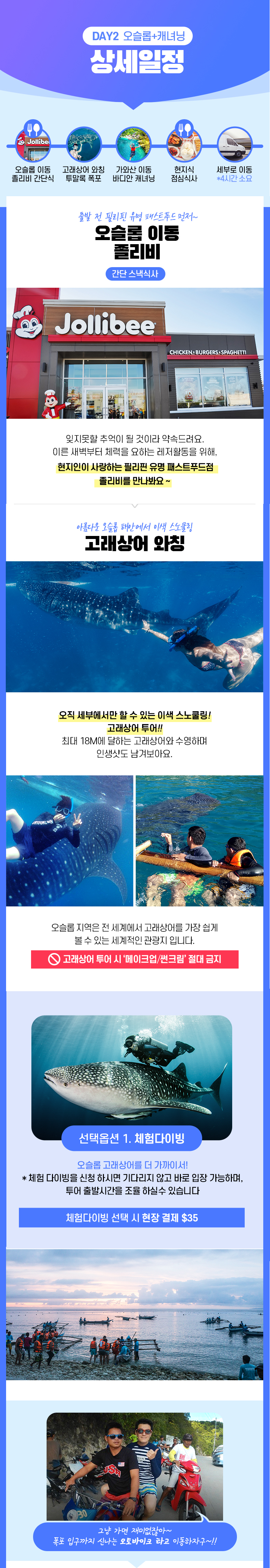 픽업(03:00) → 오슬롭 이동 간단식 → 고래상어 와칭 → 투말록 폭포 → 가와산 바디안 캐녀닝 → 점심식사 → 드랍(19:00)