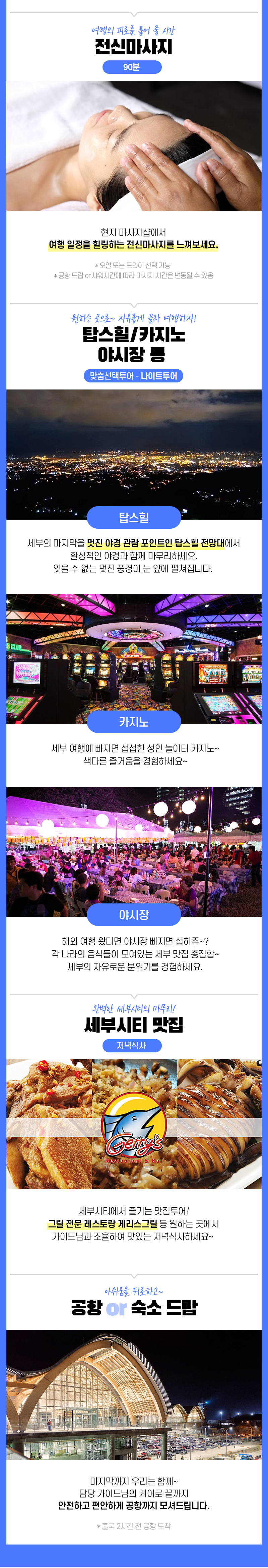 픽업(12:00) → 점심식사 → [맞춤선택투어1] 파크몰/아얄라몰/유적지/시라오가든 등 →전신마사지 90분 → [맞춤선택투어2] 탑스힐/카지노/야시장 등 →저녁식사 → 공항 드랍(23:30)