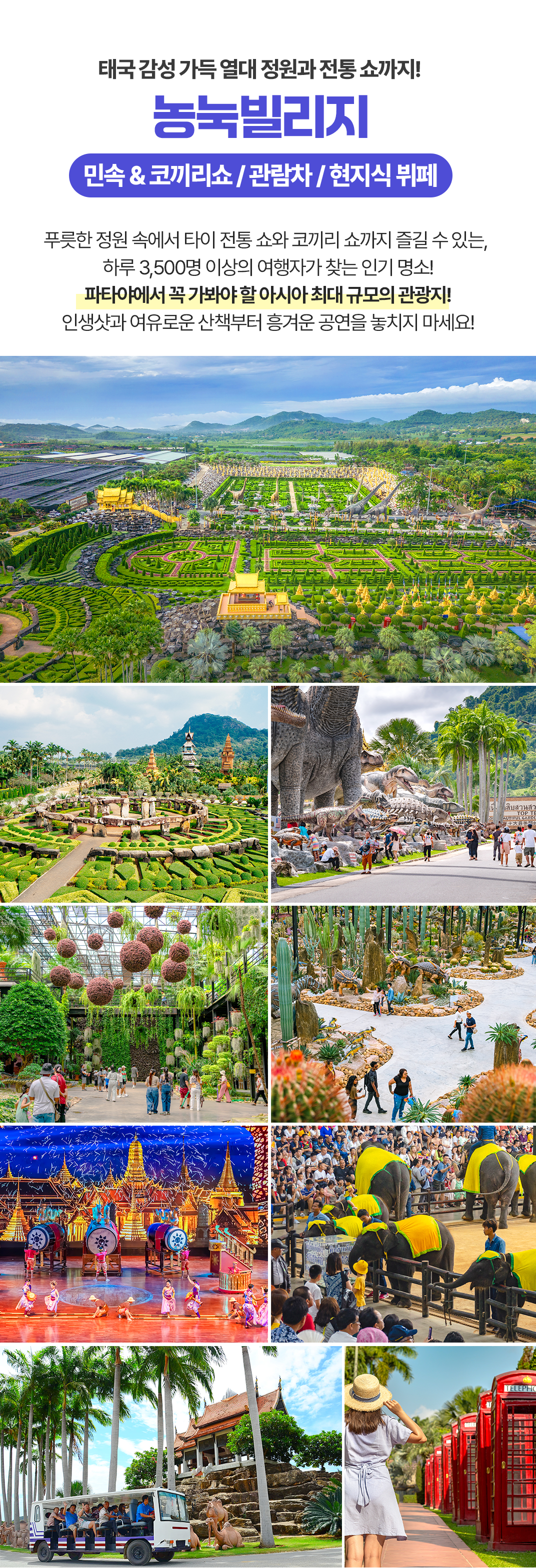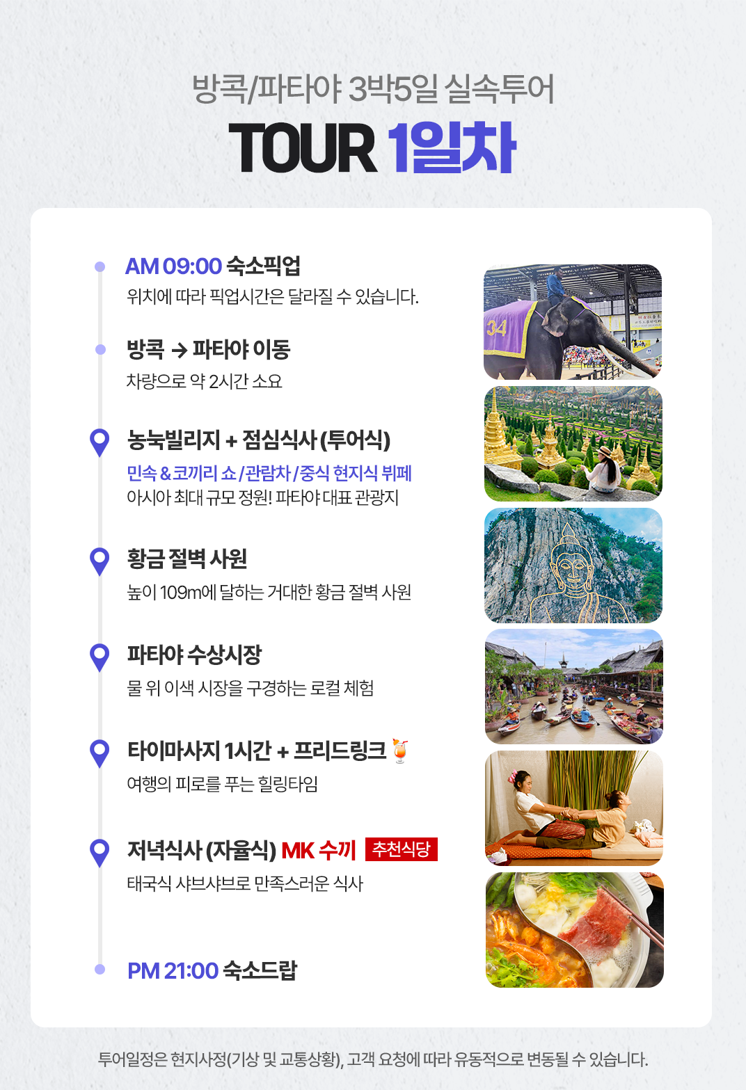 픽업(09:00) → 농눅빌리지 민속 & 코끼리쇼 (관람차/중식) → 황금 절벽사원 →파타야 수상시장(보트 탑승) → 타이마사지 1시간→ 저녁식사 → 숙소드랍(20:30)