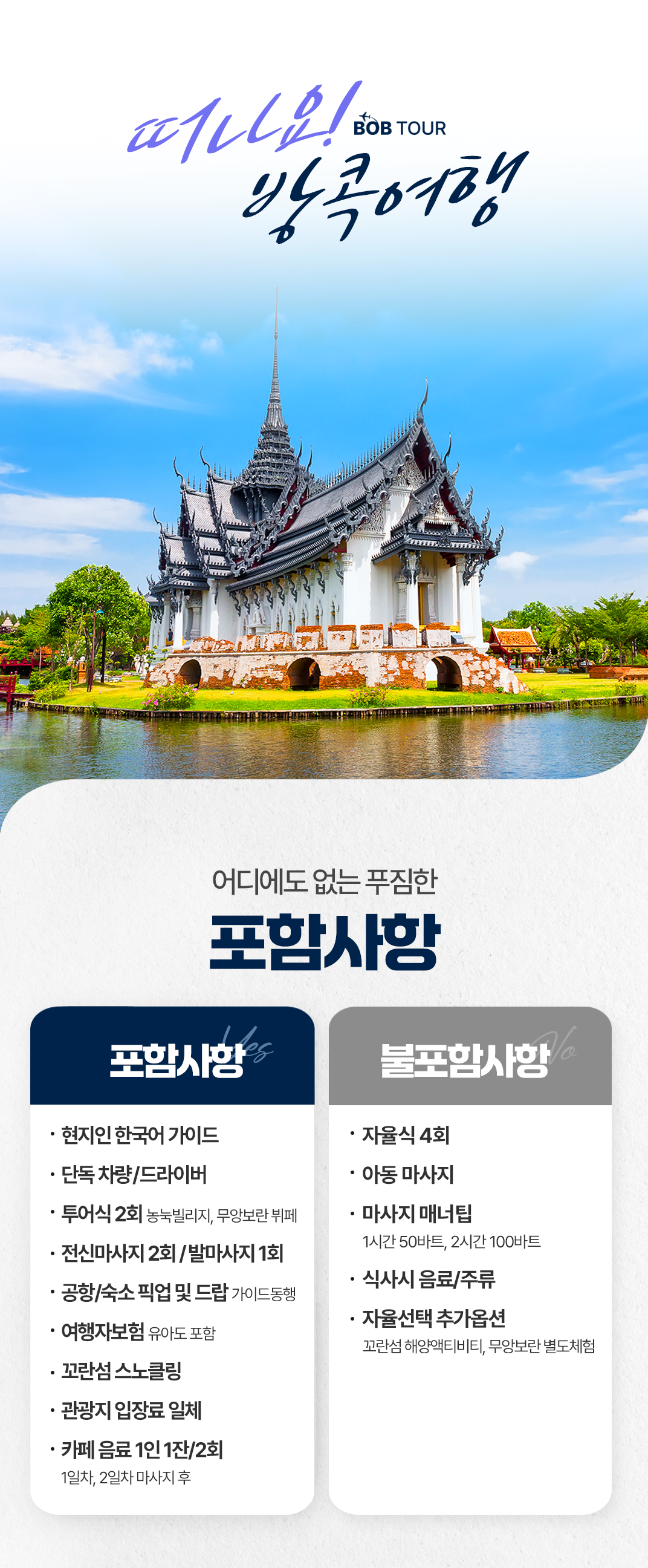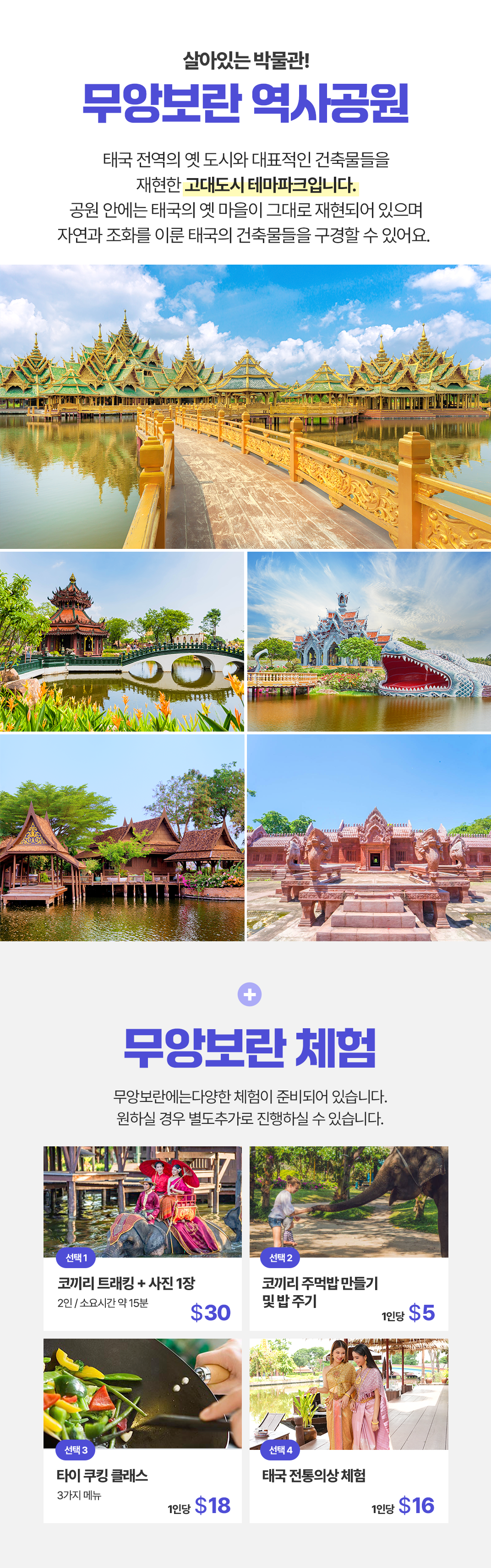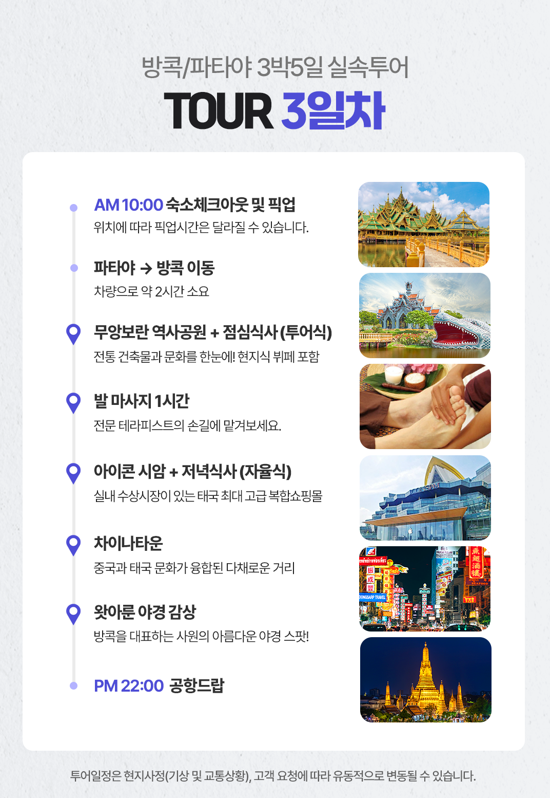 픽업(10:00) → 무앙보란 역사공원 → 점심식사 → 발마사지 마사지 60분 → 아이콘시암 → 저녁식사 → 차이나타운 → 왓 아룬 야경감상 → 공항 드랍(21:30)