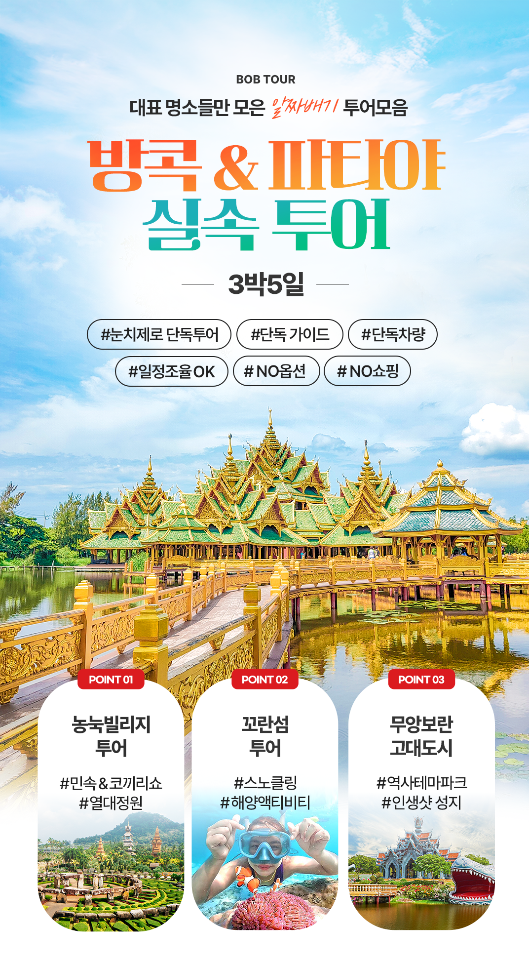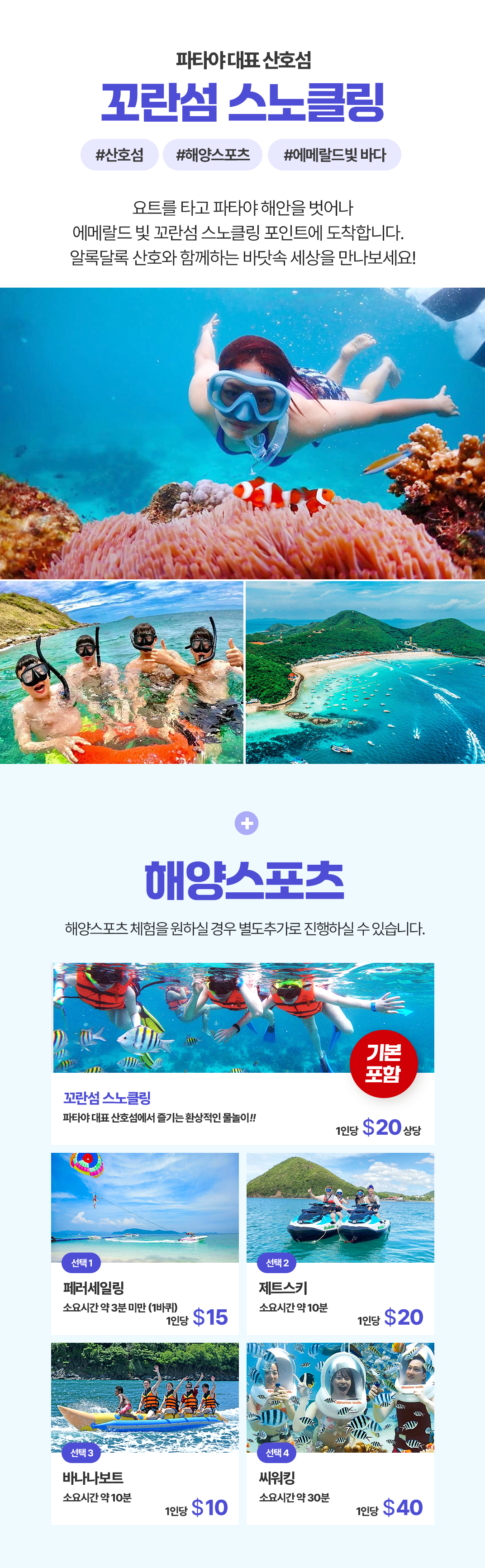 꼬란섬에서 액티비티로 산호와 해양 친구들을 만나고, 파타야의 대표 관광지들도 함께 방문할 수 있는 알찬 일정입니다!