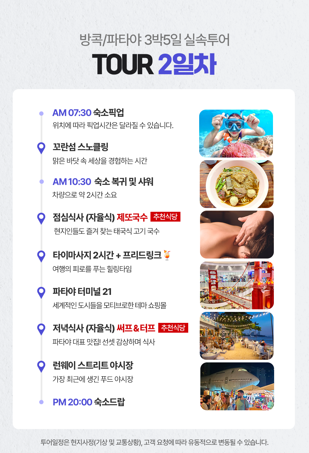 픽업(07:30) → 꼬란섬으로 이동 → 꼬란섬 (스노클링) → 점심식사 → 타이마사지120분 → 터미널21 → 저녁식사 → 런웨이 스트리트 야시장 → 숙소드랍(20:00)