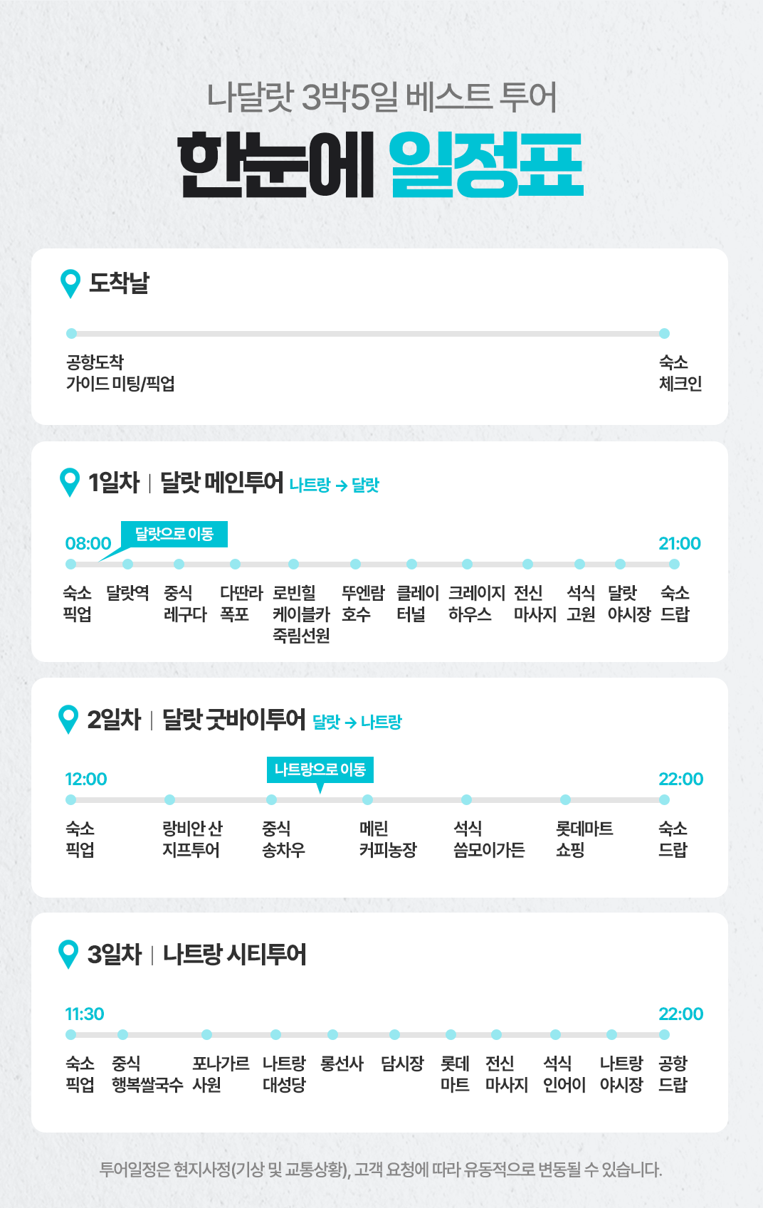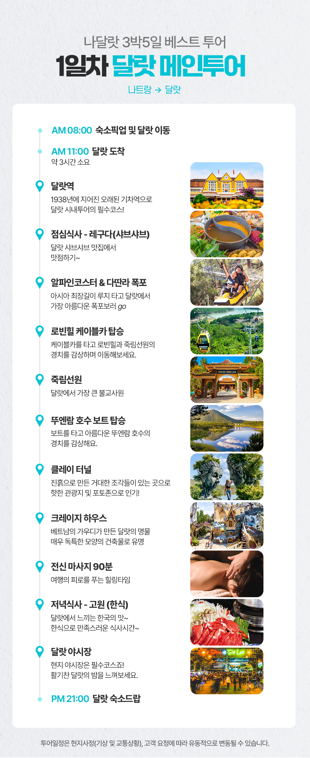 픽업(8:00) → 달랏역 구경 및 중식(11:0013:30) → 다란라 폭포 및 로빈힐 케이블카(13:3015:30) → 죽림선원 & 뚜엔람 & 클레이터널(15:3016:40) → 크레이지하우스 후 90분 전신마사지(16:4019:00) → 석식(고원식당) 및 야시장 구경(19:00~21:00) → 리조트 드랍(21:00)