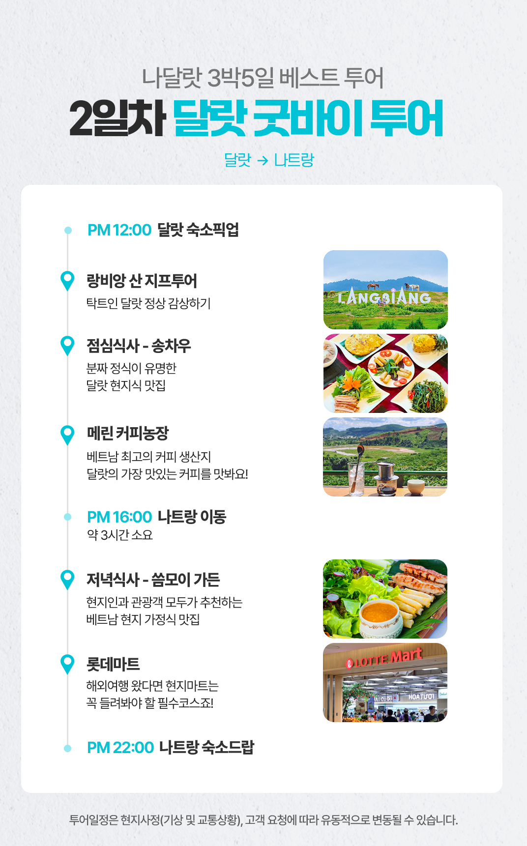 12:00 리조트 픽업 → 랑비앙산 투어(12:0013:30) → 중식(송차우, 13:3014:30) → 메린커피농장(14:3016:00) → 나트랑 이동(16:0019:00) → 석식(씀모이가든) 및 롯데마트 쇼핑(19:00~22:00) → 22:00 리조트 드랍