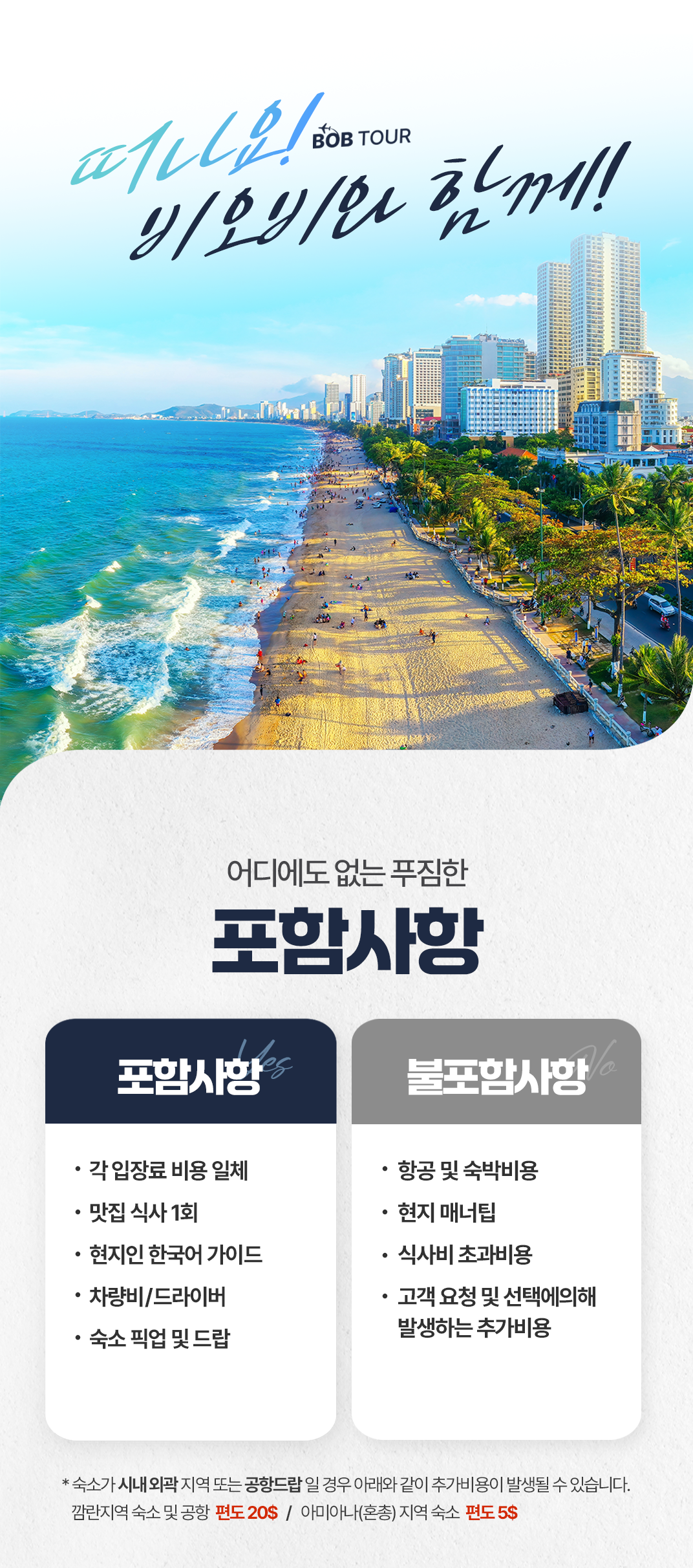 📢 나트랑 시내 숙소 기준이며 깜란지역, 혼총지역, 빈펄섬 지역은 픽드랍 추가금이 발생합니다.