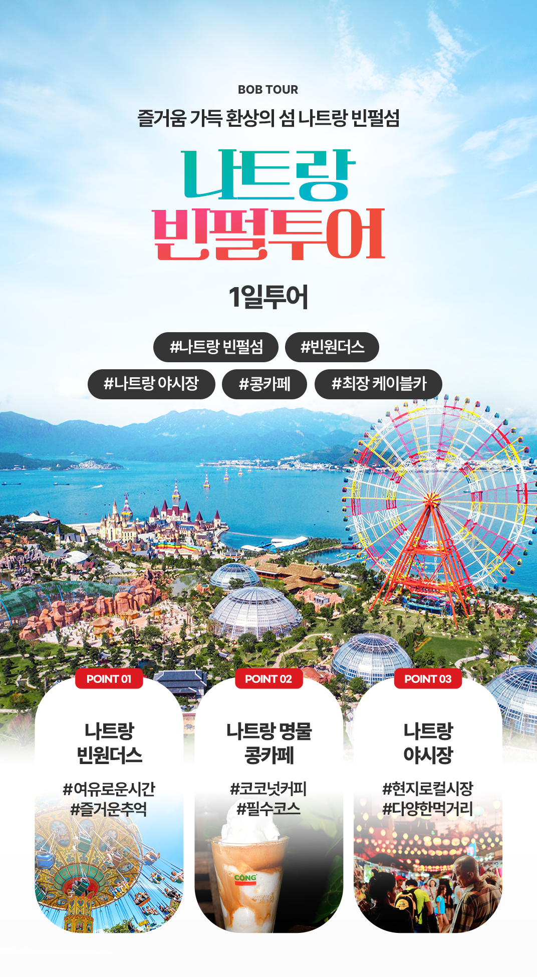 픽업(11:30) → 빈원더스 자유일정(12:00~17:00) → 마사지(17:00~19:00)→ 석식(자율식(포함)) → 콩카페(20:00~20:30) → 나트랑야시장(20:30~21:30)→ 숙소 드랍