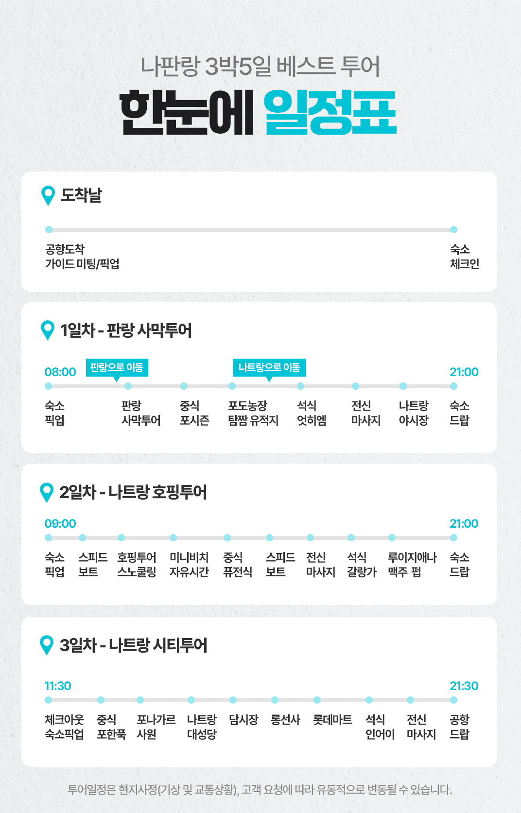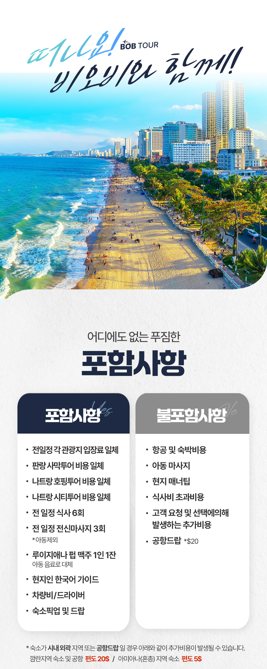 📢 나트랑 시내 숙소 기준이며 깜란지역, 혼총지역, 빈펄섬 지역은 픽드랍 추가금이 발생합니다.