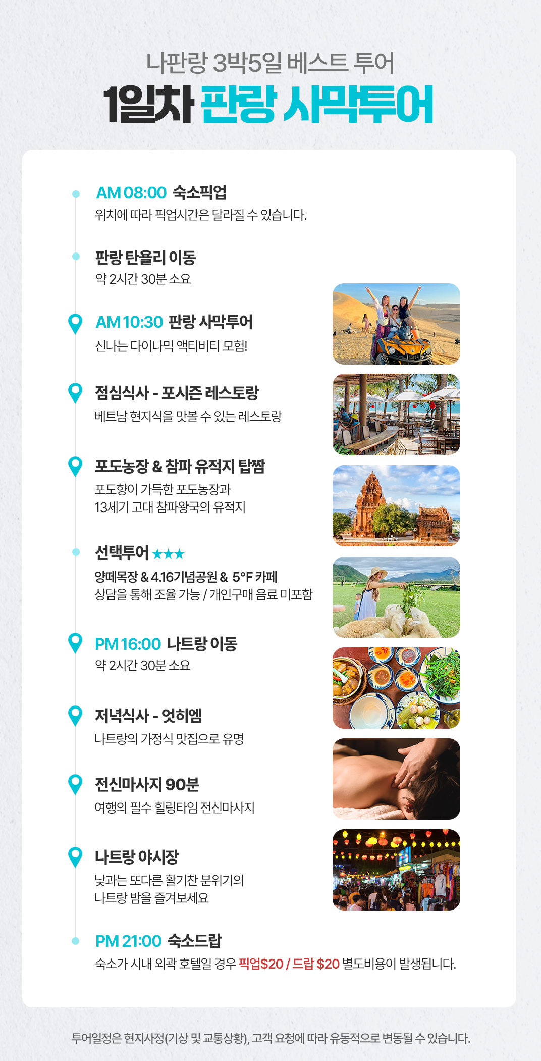 픽업(8:00) → 양떼목장 및 포도농장(10:00~12:00) → 중식(12:00~13:00) → 판랑사막투어 및 추가요청 투어(13:00~15:00) → 90분 전신마사지(18:00~20:00) → 석식(20:00~21:00) → 리조트 드랍(21:00)