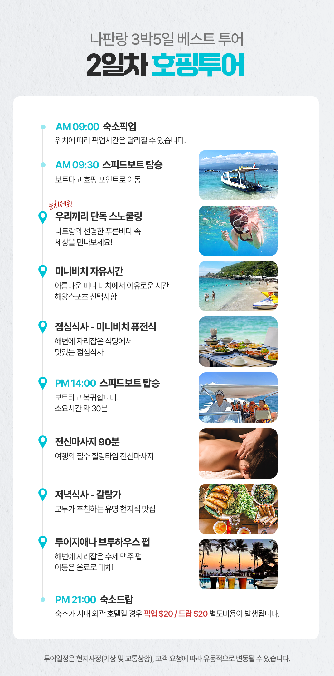 픽업(09:00) → 스노클링 및 섬 내 중식(09:00~13:30)→마사지(13:30~16:00)→석식(16:00~18:00)→루이지애나 펍(18:00~20:00)→ 리조트 드랍