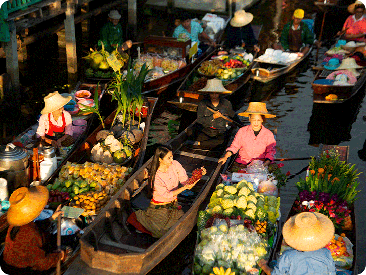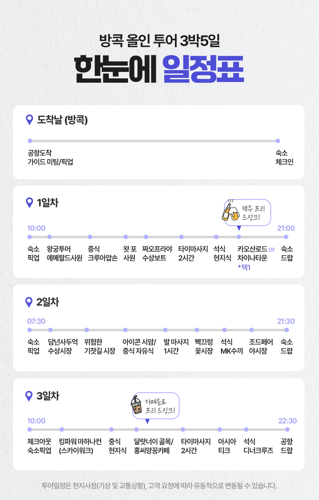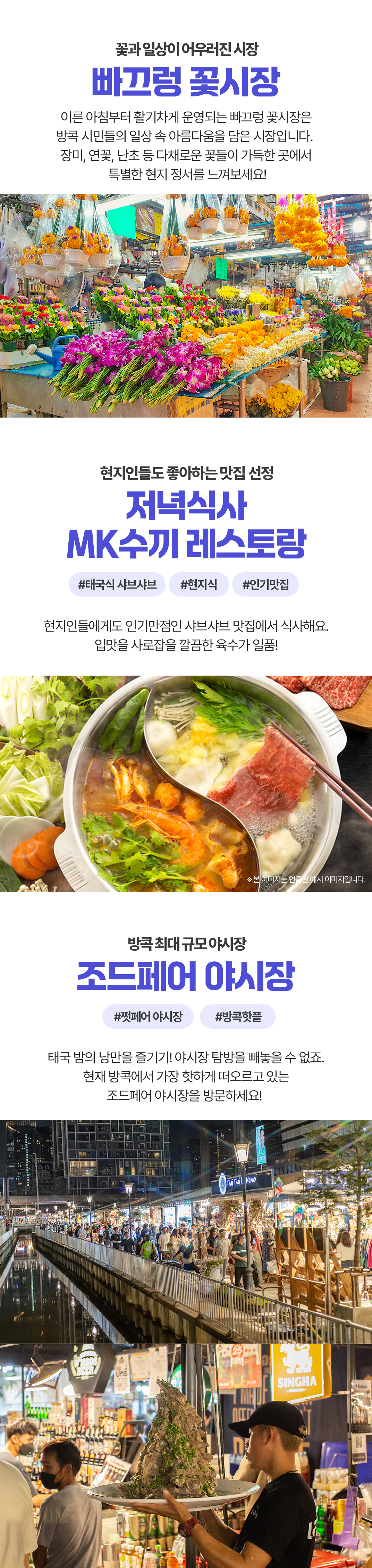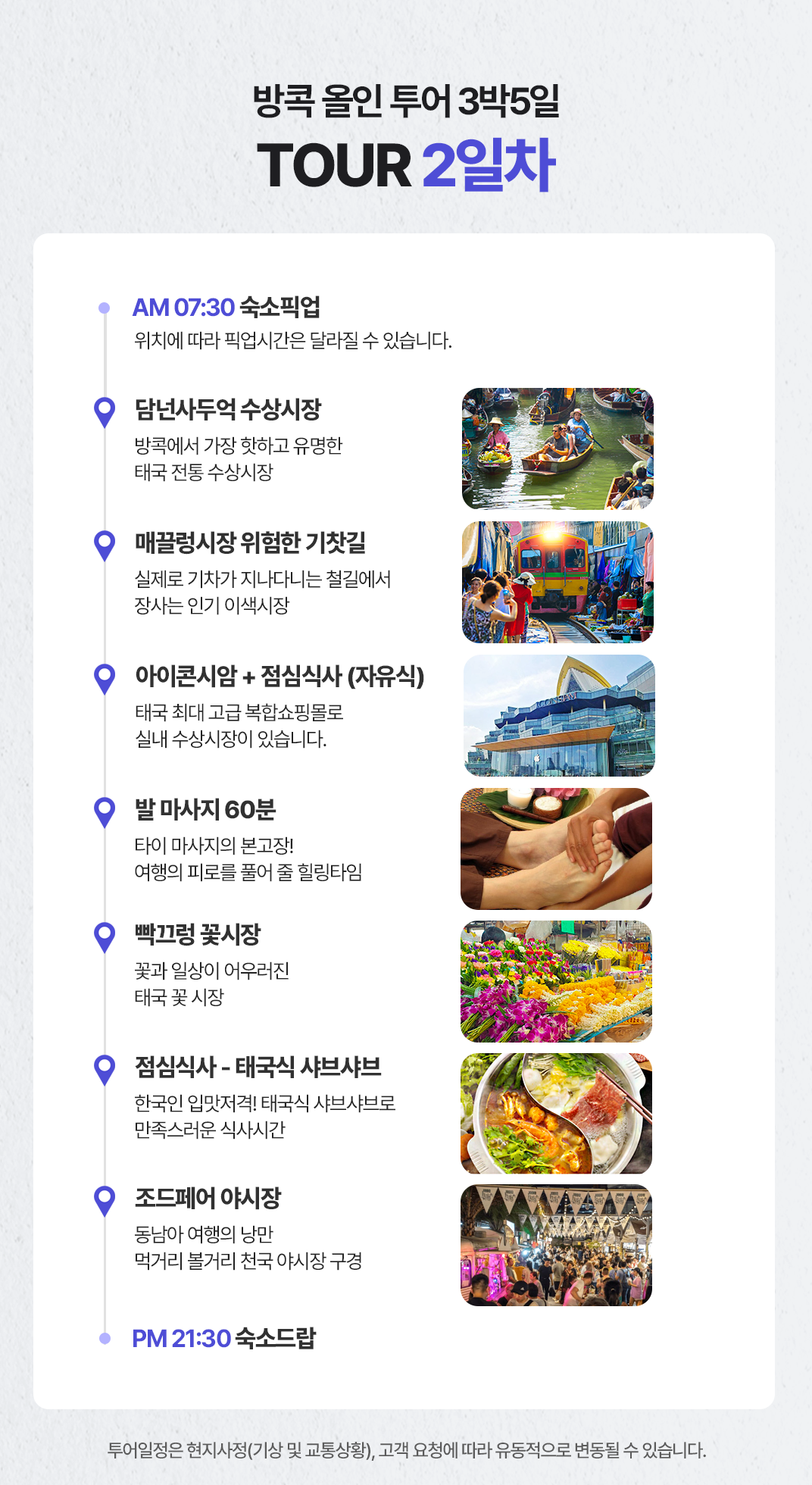 픽업(07:30) → 담넌사두억 수상시장 → 매끌렁시장 위험한 기찻길 → 아이콘시암/중식 → 발마사지 1시간 → 빡끌렁 꽃시장 → 석식 → 조드페어 야시장 → 드랍(21:30)
