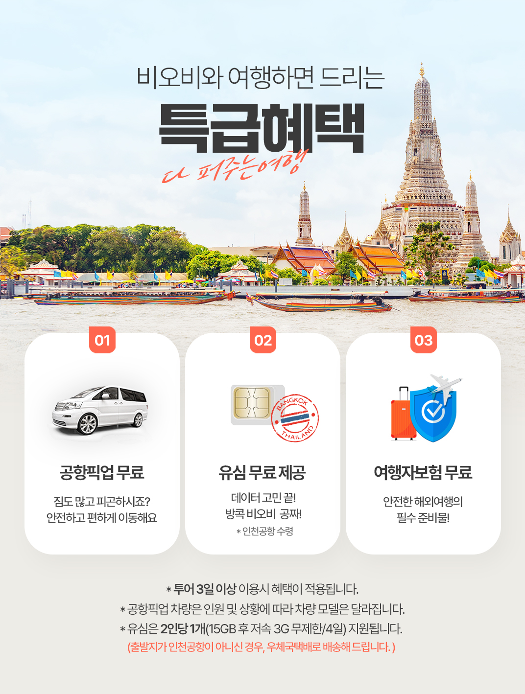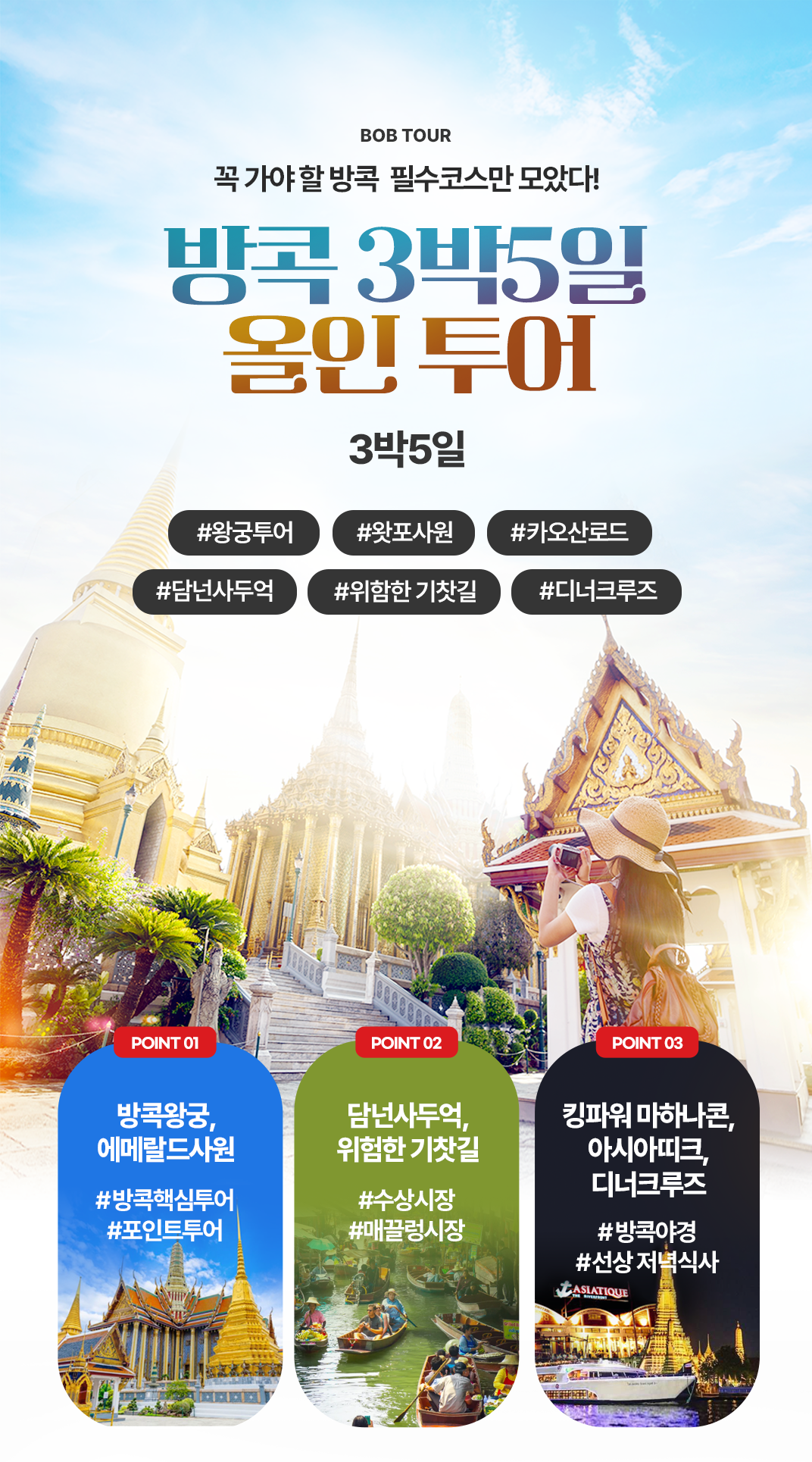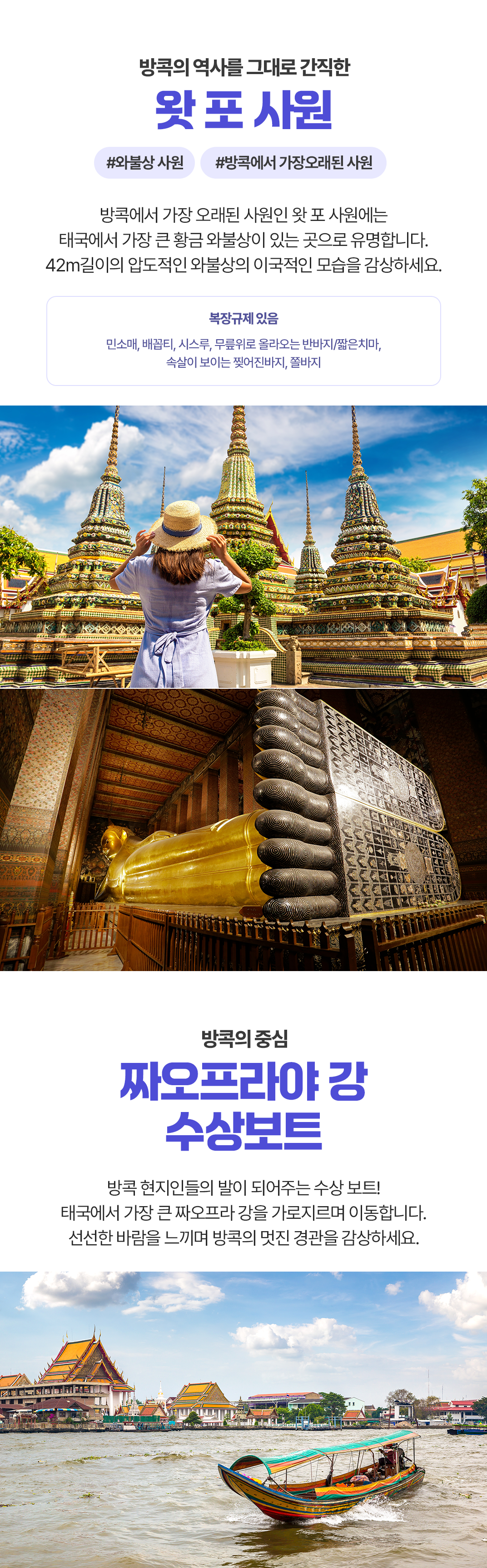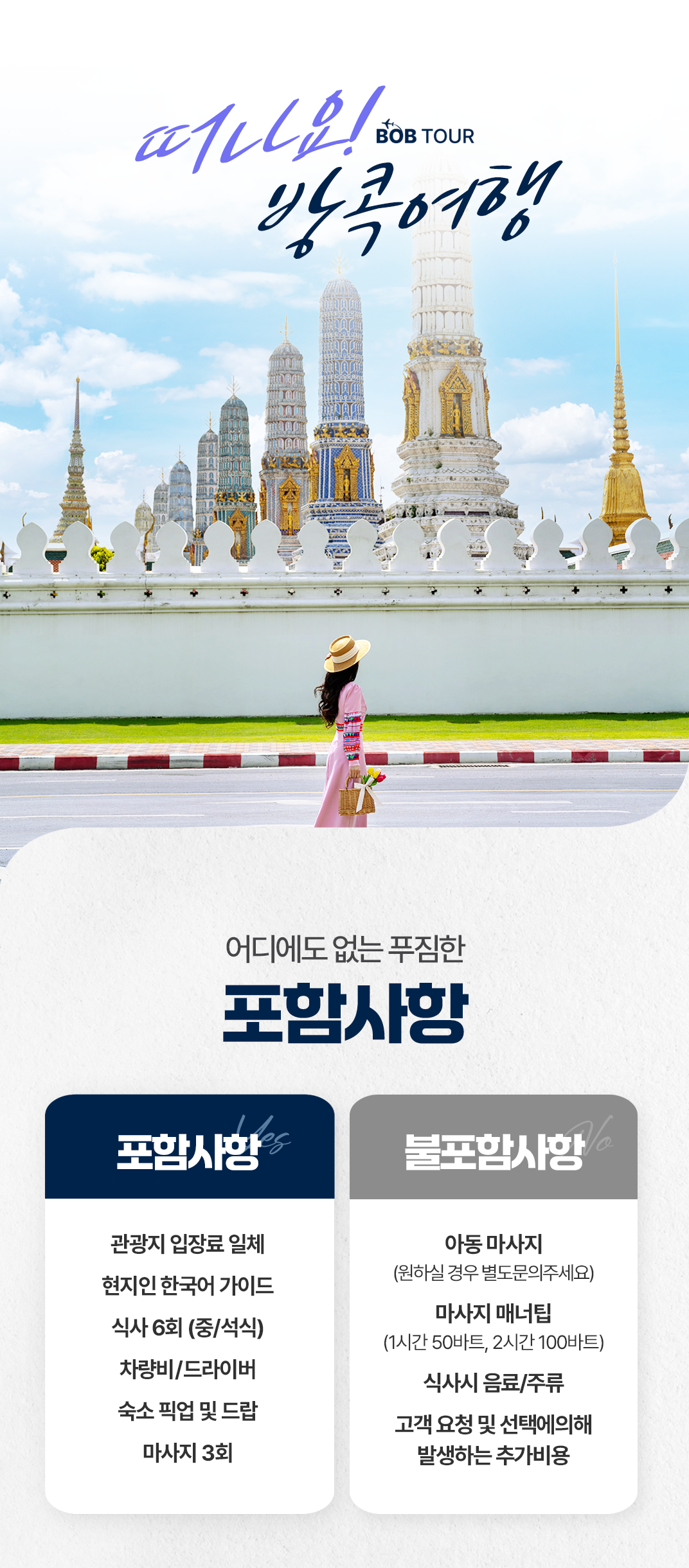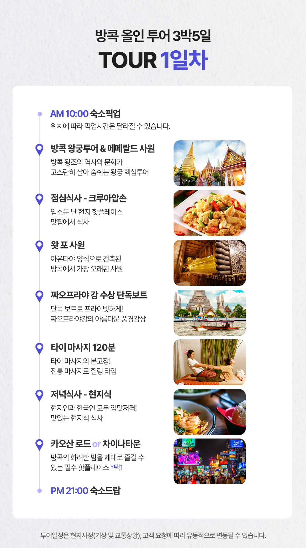 픽업(10:00) → 왕궁투어 에메랄드 사원 → 중식 → 왓포사원 → 짜오프라야 수상보트 → 타이마사지 2시간 → 석식 → 카오산로드 or 차이나타운(택1) → 드랍(21:00)