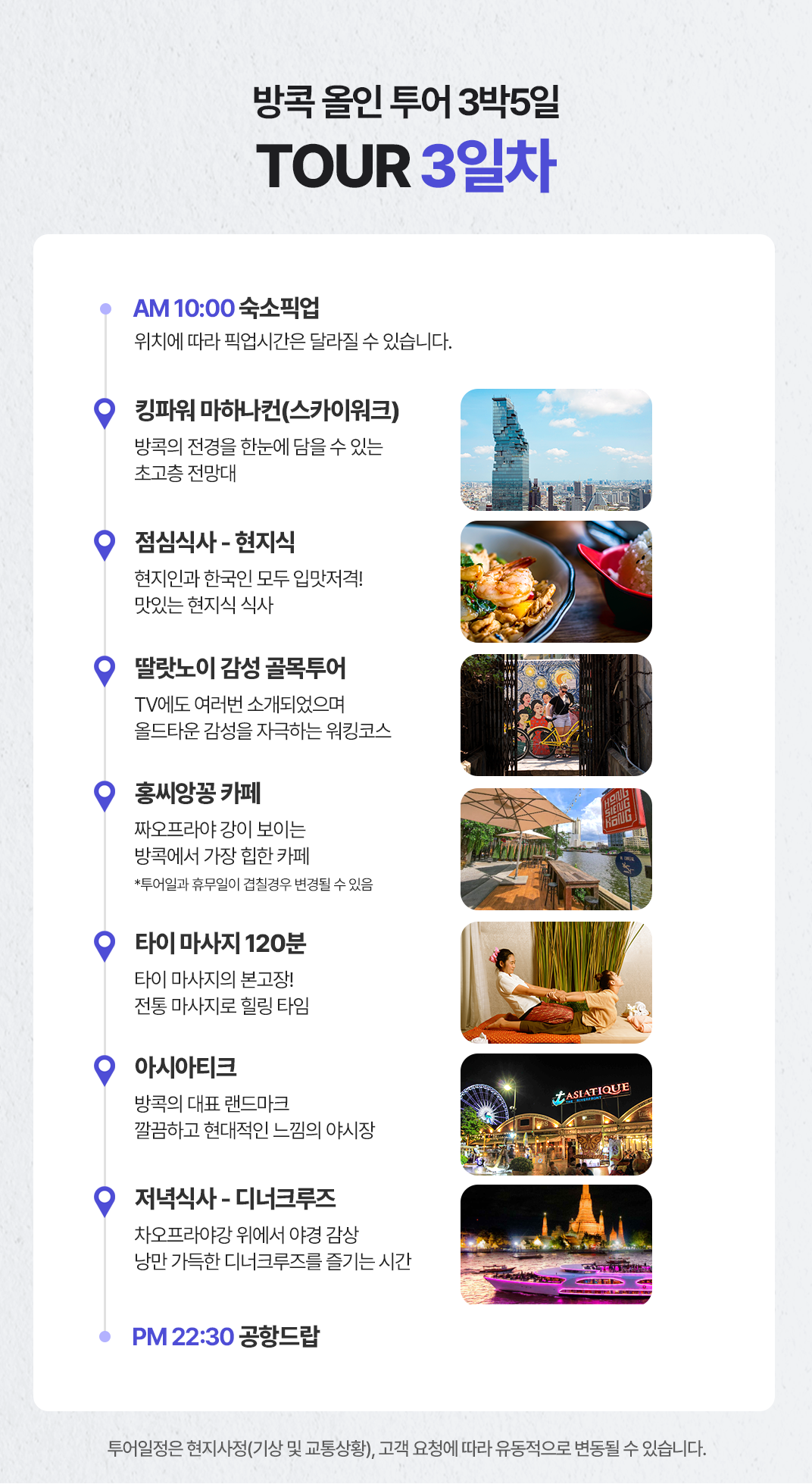 픽업(10:00) → 킹파워마하나컨(스카이워크)→ 중식→ 달란너이 골목/홍씨앙꽁카페→ 타이마사지 2시간→ 아시아티크→ 석식 → 공항 드랍(22:30)
