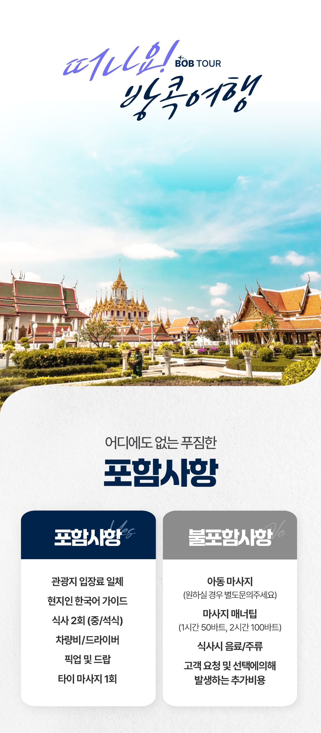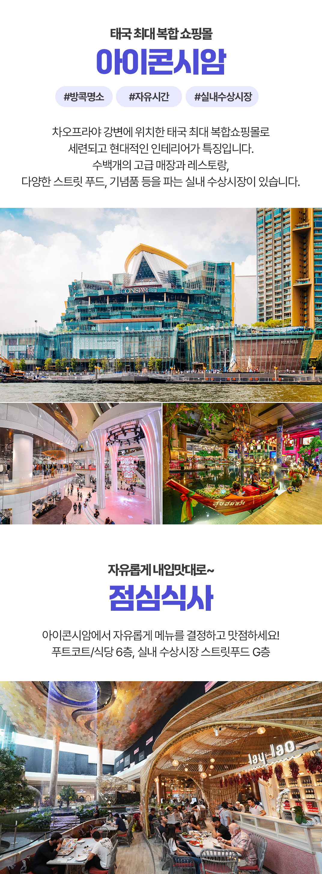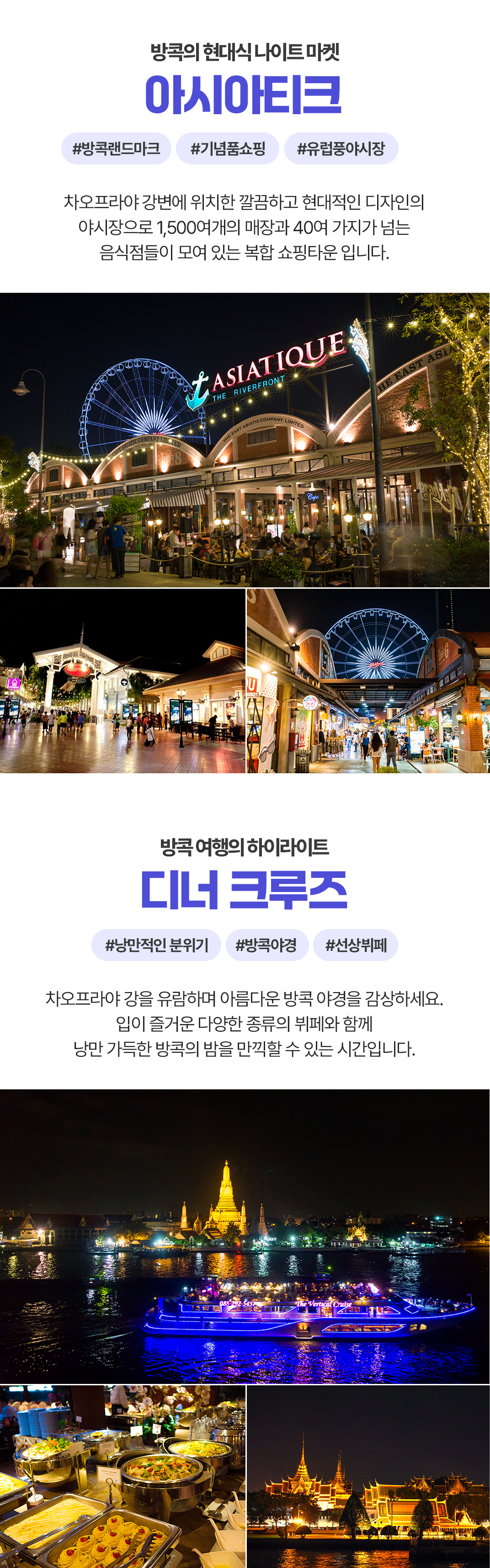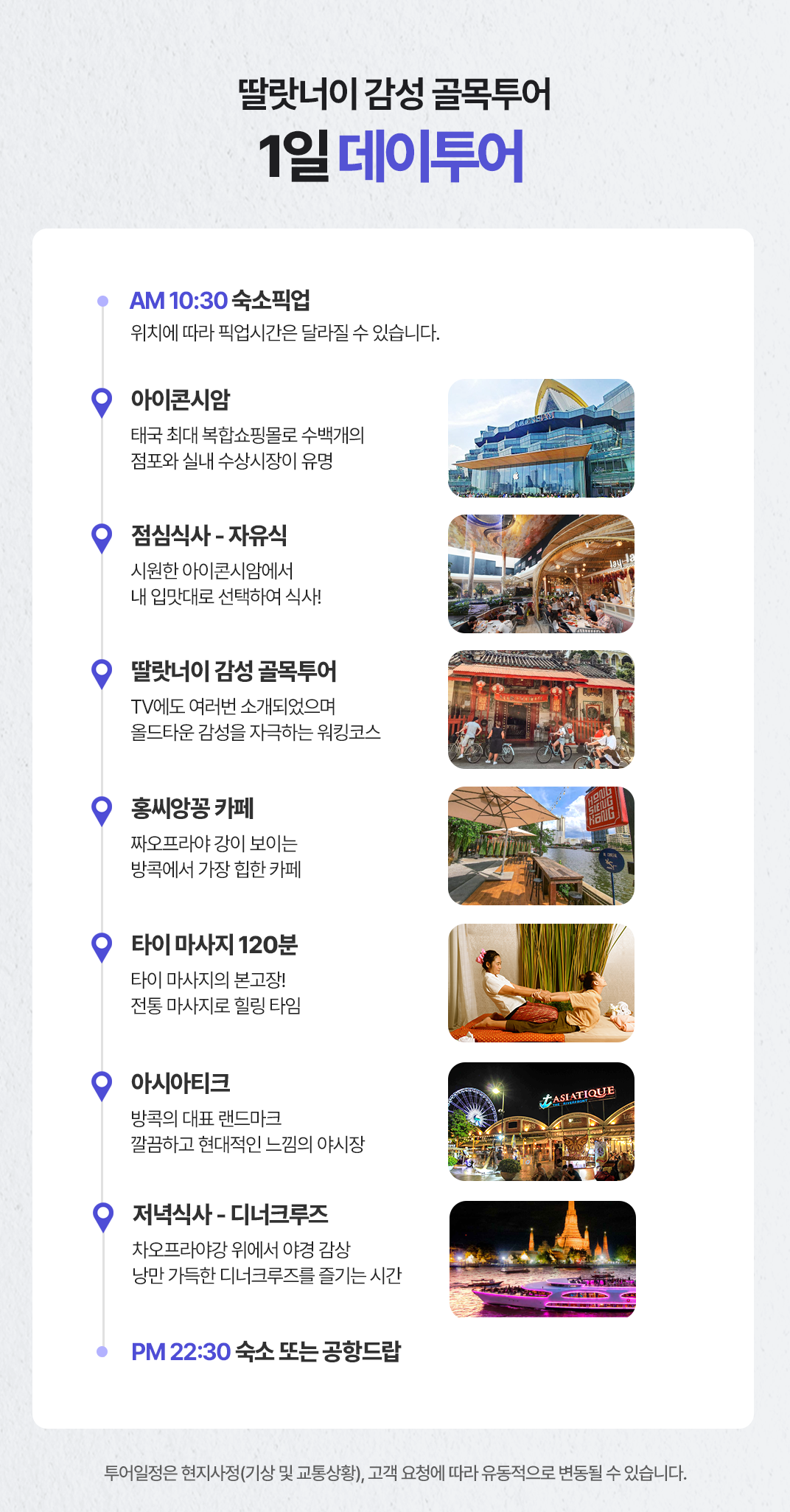 픽업(10:30) → 아이콘시암 → 점심식사 → 딸랏너이 감성 골목투어 → 홍씨앙꽁 카페 → 타이 마사지 120분 → 아시아티크 → 저녁식사(디너크루즈) → 드랍(23:30)
