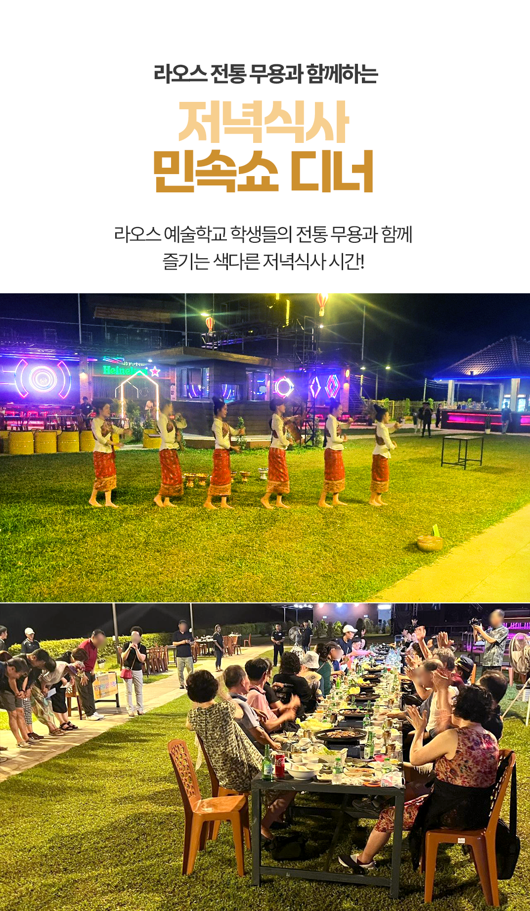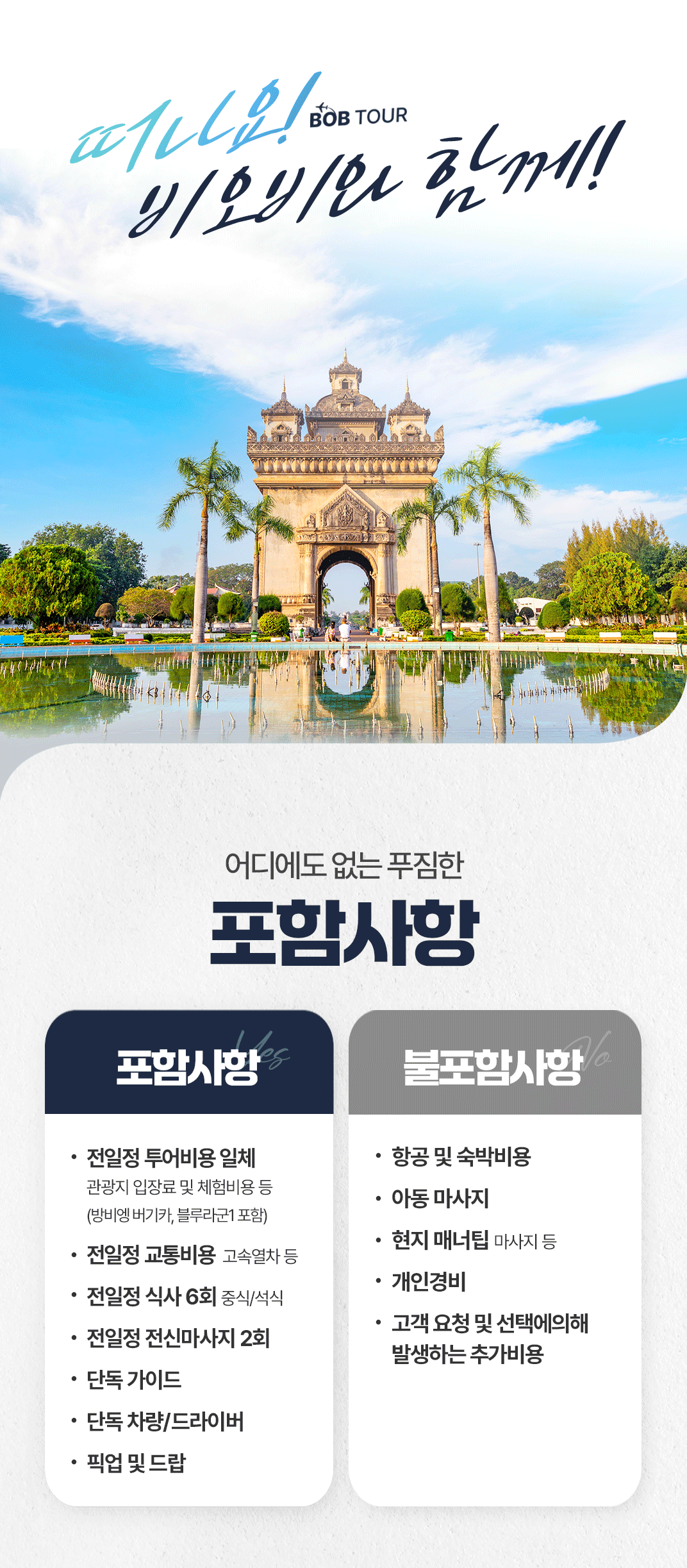 픽업(08:00) → 롱테일 보트 → 비엔티안 이동(차량 약 2시간) → 목각 박물관 → 중식 → 왓 시 사켓 / 호 파 케우 사원 → 팍슨몰 → 전신마사지 2시간 → 석식 → 탓 루앙 사원(황금사원) → 독립문 빠뚜사이 → 메콩강 야시장 → 공항드랍(21:30)