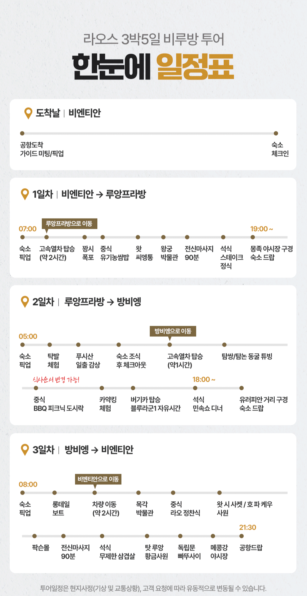 픽업(07:00) → 고속열차 탑승(약 2시간) → 꽝시폭포 → 중식 → 왓 씨엥통 → 왕궁 박물관 → 전신 마사지 2시간 →석식 → 몽족 야시장 구경 및 숙소 드랍(19:00)