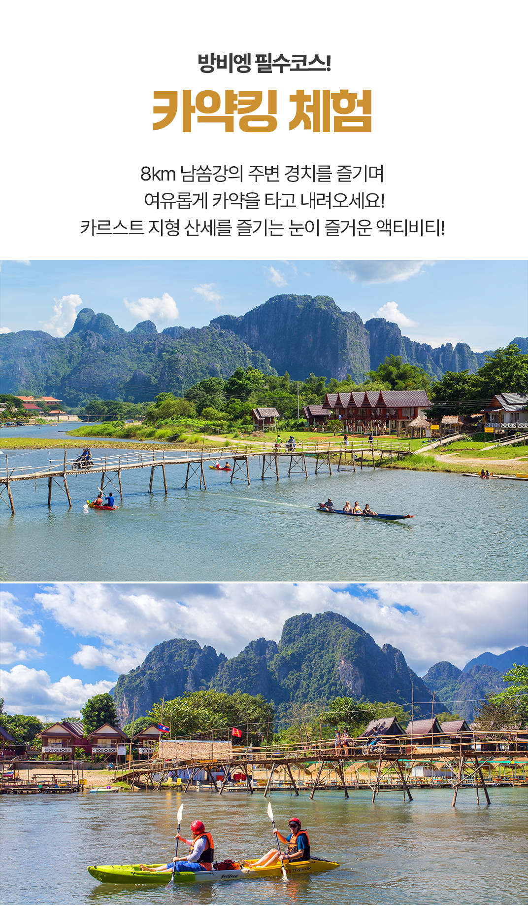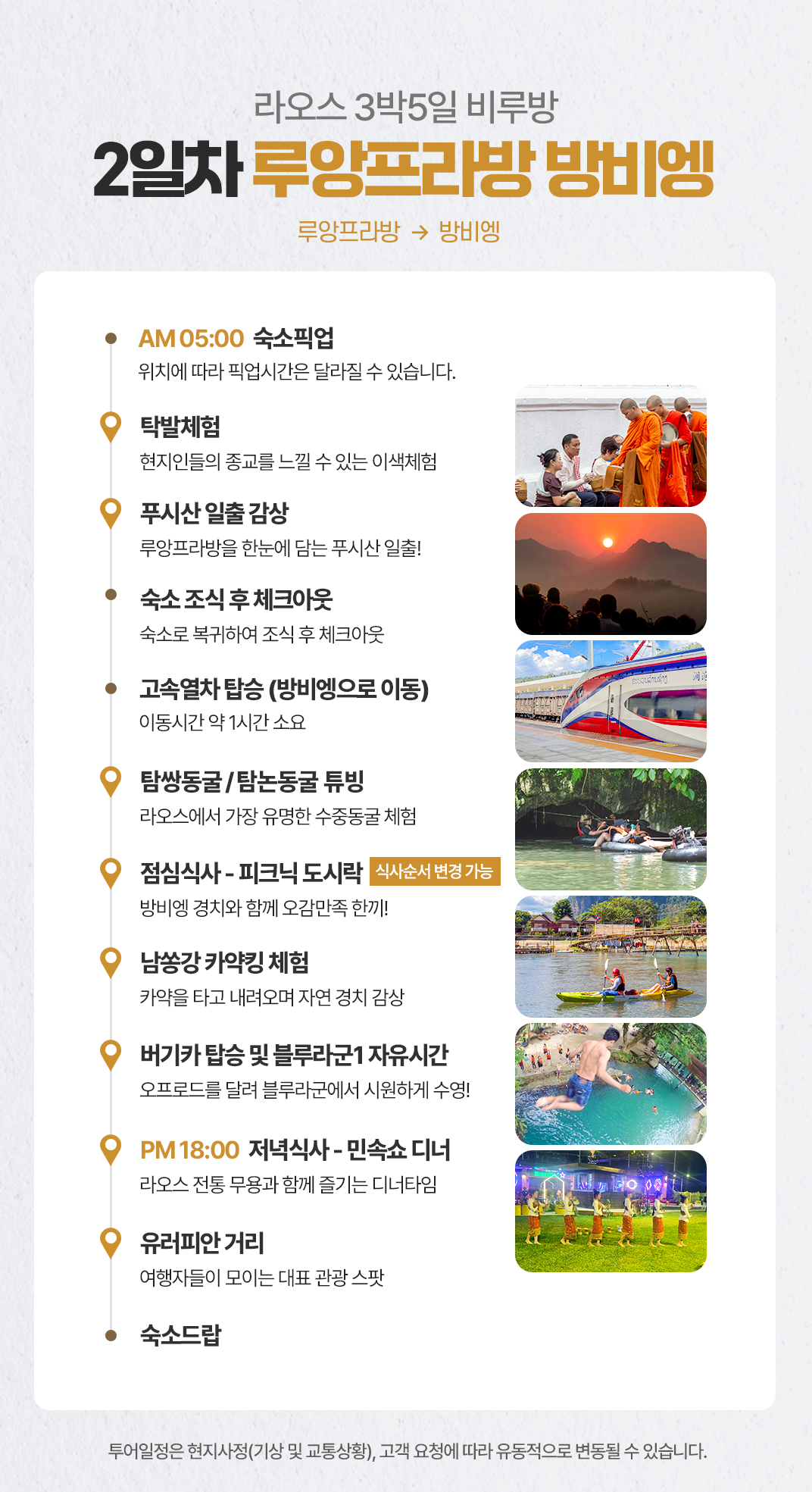 픽업(05:00) → 탁발체험 → 푸시산 일출 감상 → 숙소 조식 후 체크아웃 → 고속열차 탑승(약 1시간) → 탐쌍 / 탐논 동굴 튜빙 → 중식 → 카약킹 체험 → 버기카 탑승, 블루라군 1, 짚라인 → 석식(18:00) → 유러피안 거리 구경 후 숙소 드랍