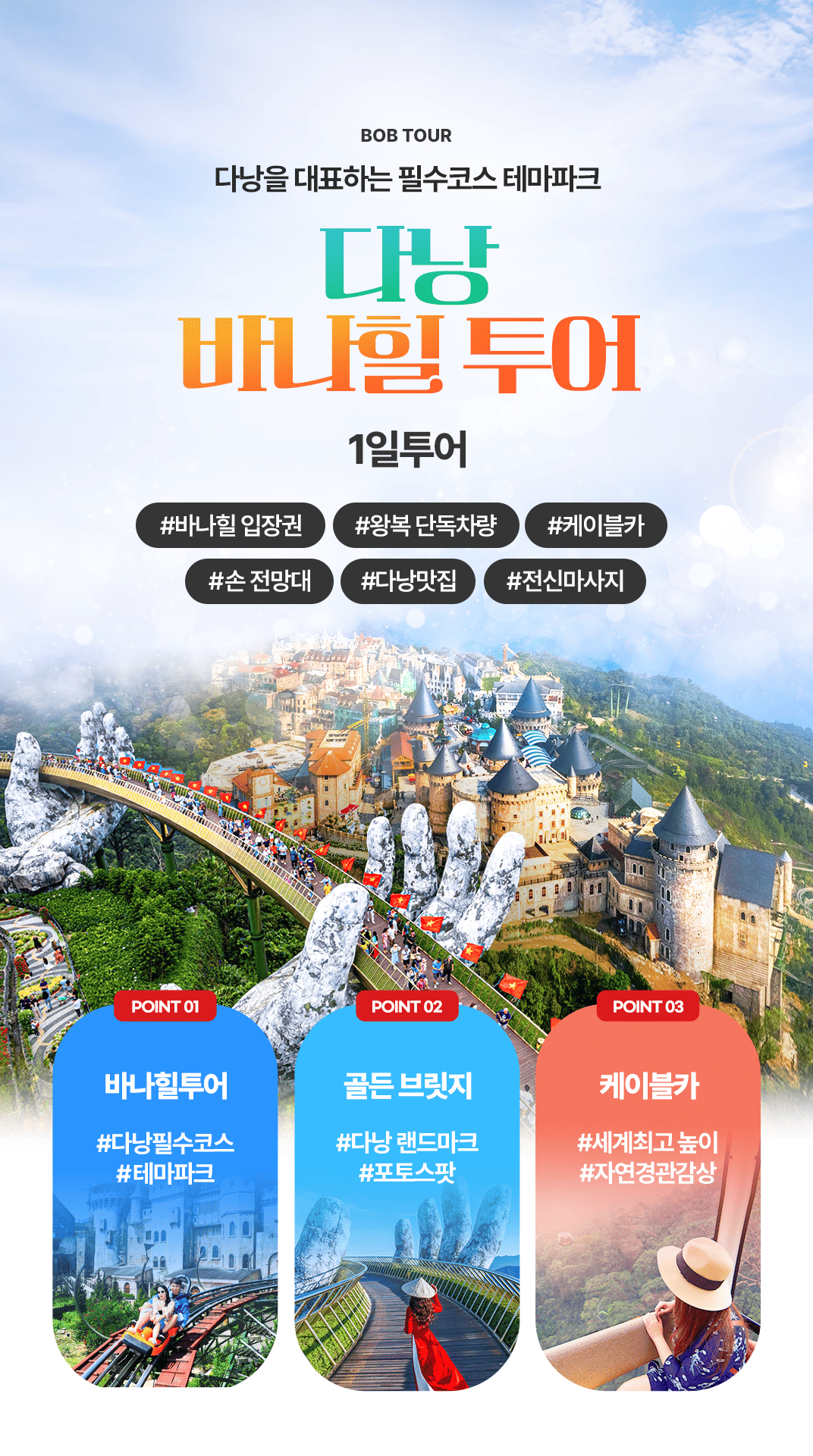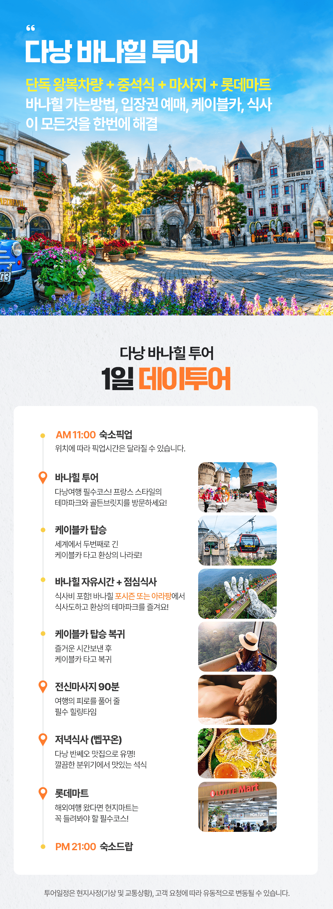 픽업(11:00) → 바나힐 도착후 케이블카 탑승후 이동 → 점심식사 → 바나힐 자유시간 → 전신마사지 90분 → 저녁식사 → 롯데마트 방문 → 공항 드랍