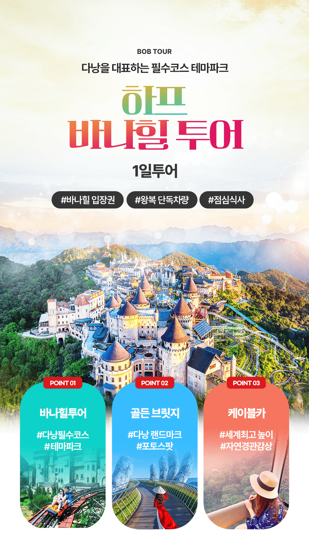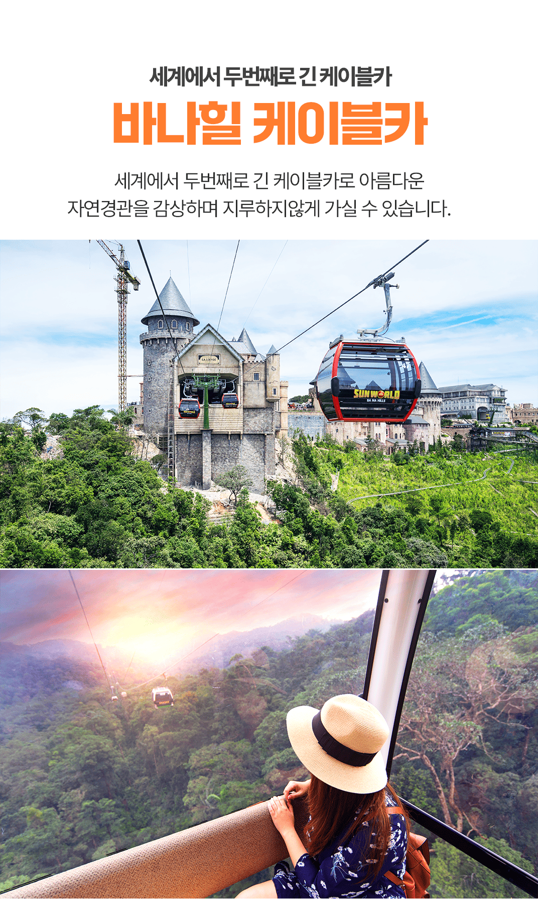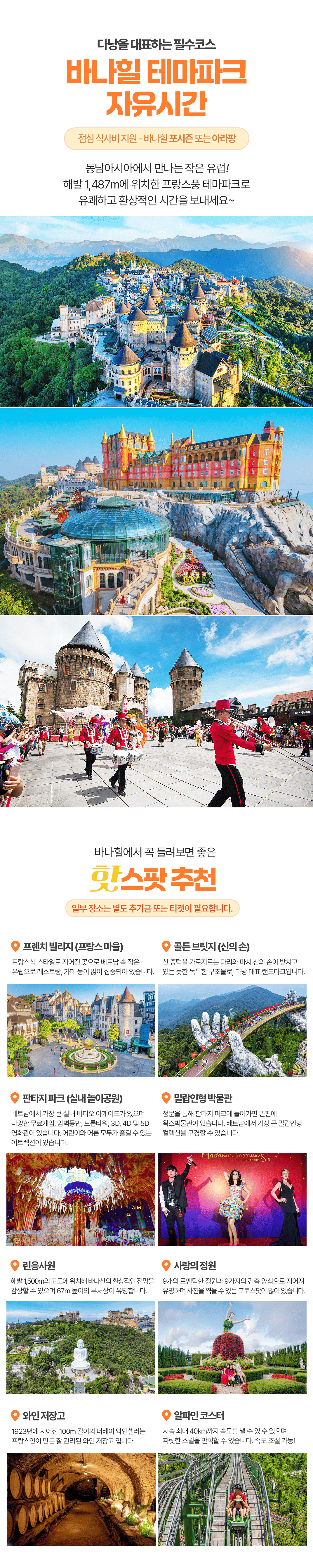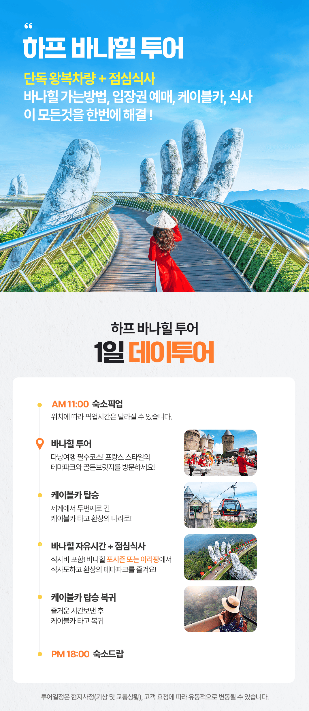픽업(11:00) → 바나힐 도착후 케이블카 탑승후 이동 → 점심식사 → 바나힐 자유시간 → 리조트드랍