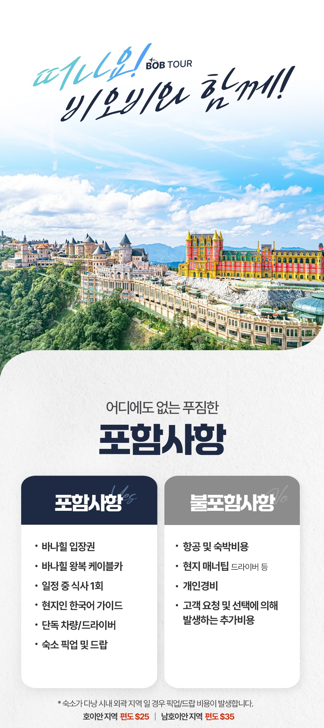 - 숙소가 다낭시내 외곽지역 일 경우 추가비용(호이안지역 편도 $25 / 남호안 지역 편도 $35)
