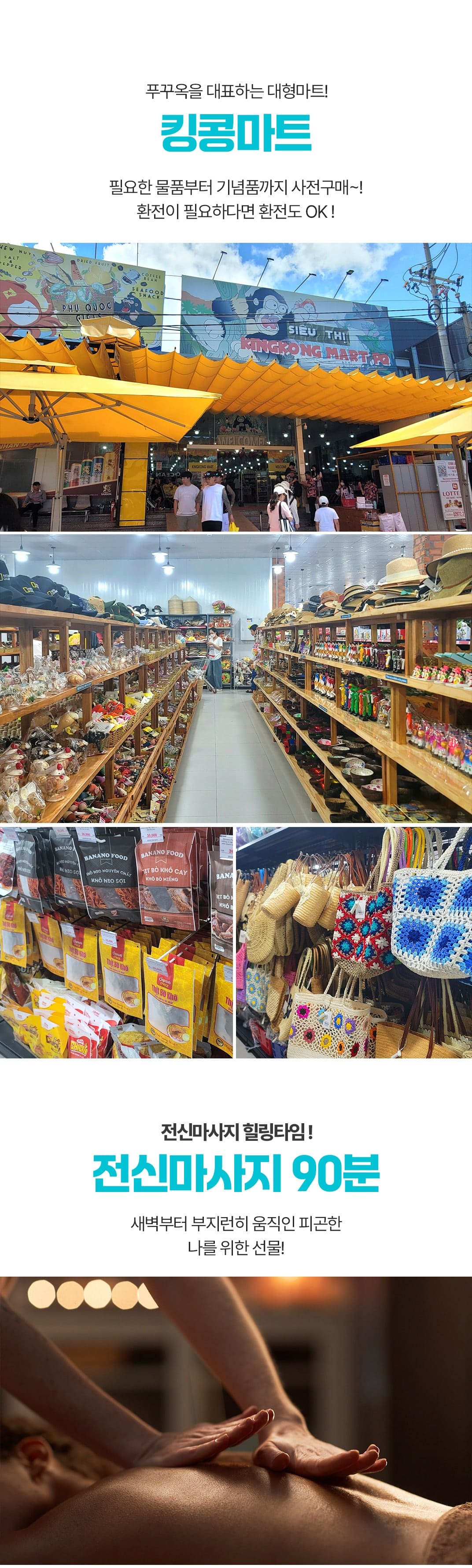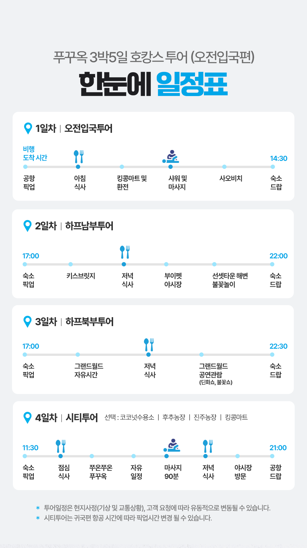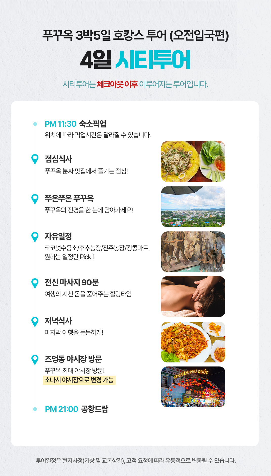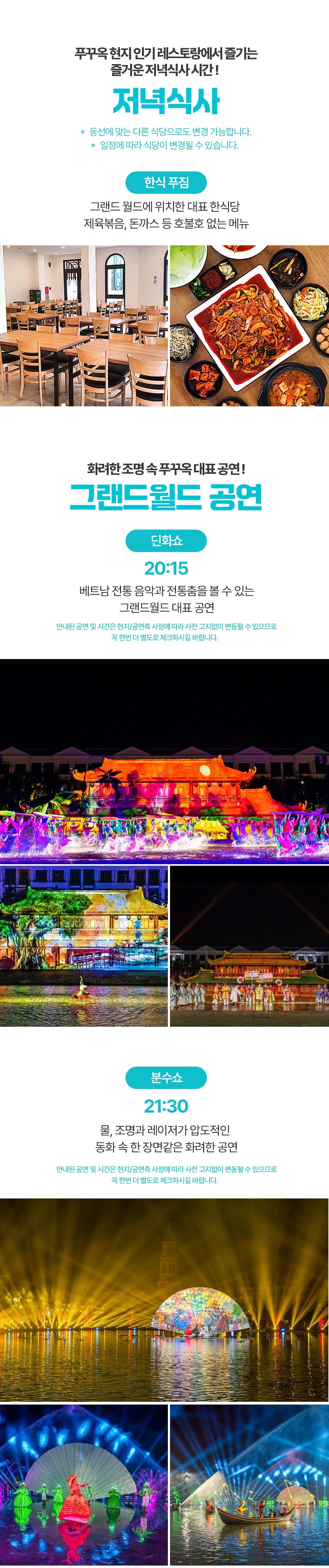 픽업(11:30) → 점심식사 → 쭈온쭈온푸꾸옥→ 자유일정 (코코넛 수용소 &후추농장/진주농장/킹콩마트 중 원하는 일정)→ 마사지90분→ 저녁식사→ 야시장→ 공항드랍(21:00)