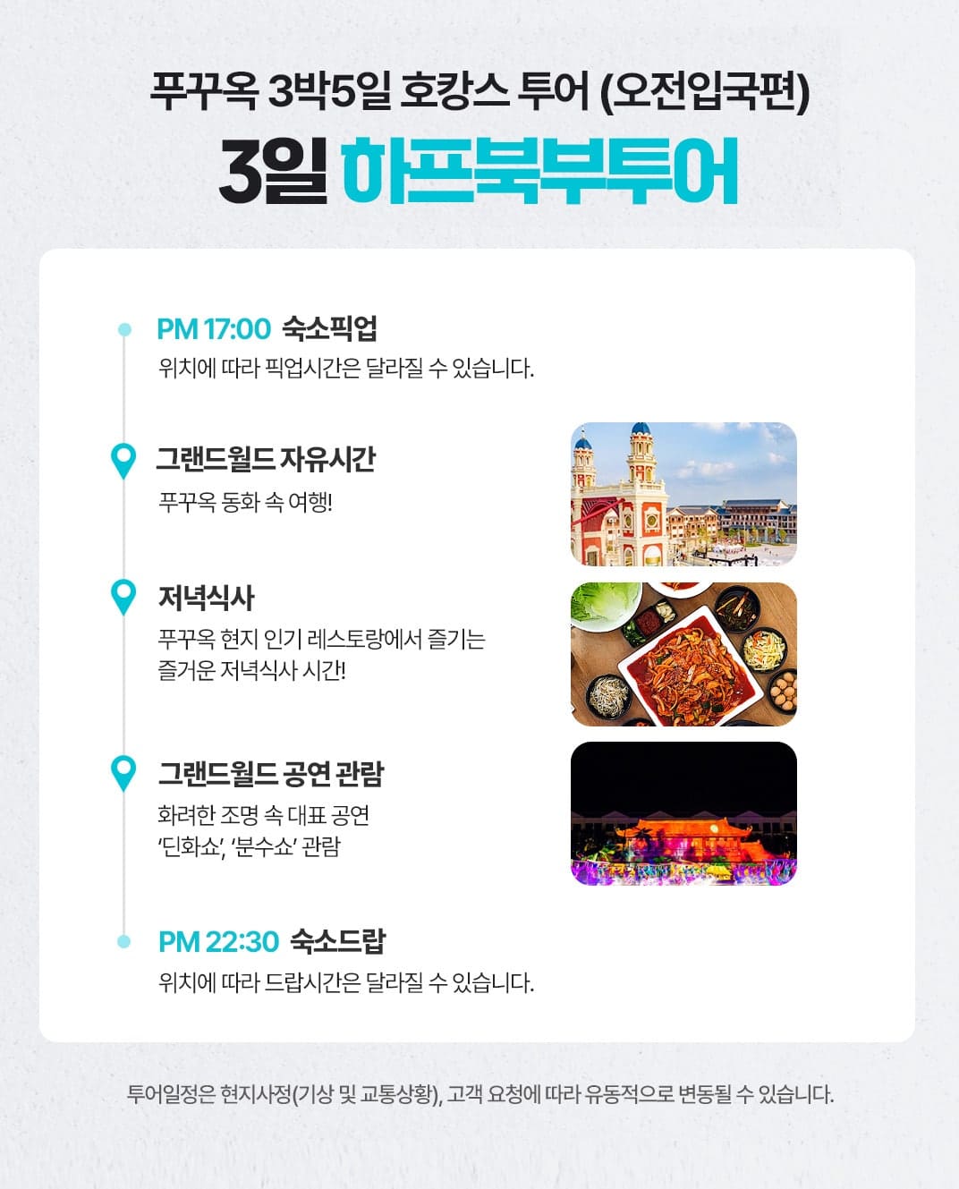 픽업(17:00) → 그랜드월드 자유시간 → 저녁식사 → 그랜드 월드 공연관람 → 숙소드랍 ( 22:30)