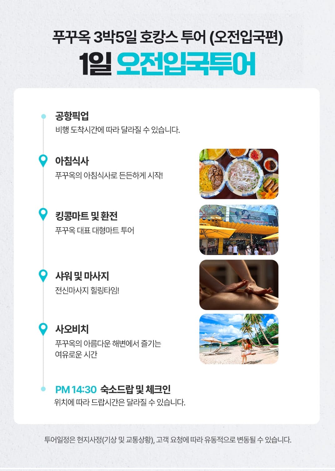 공항 픽업 → 아침식사 → 킹콩마트 및 환전 → 샤워 및 마사지 → 사오비치 → 숙소드랍 및 체크인 (14:30)
