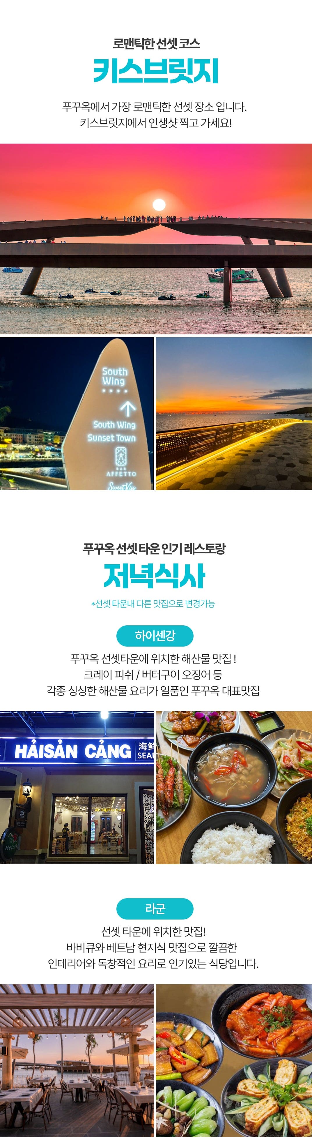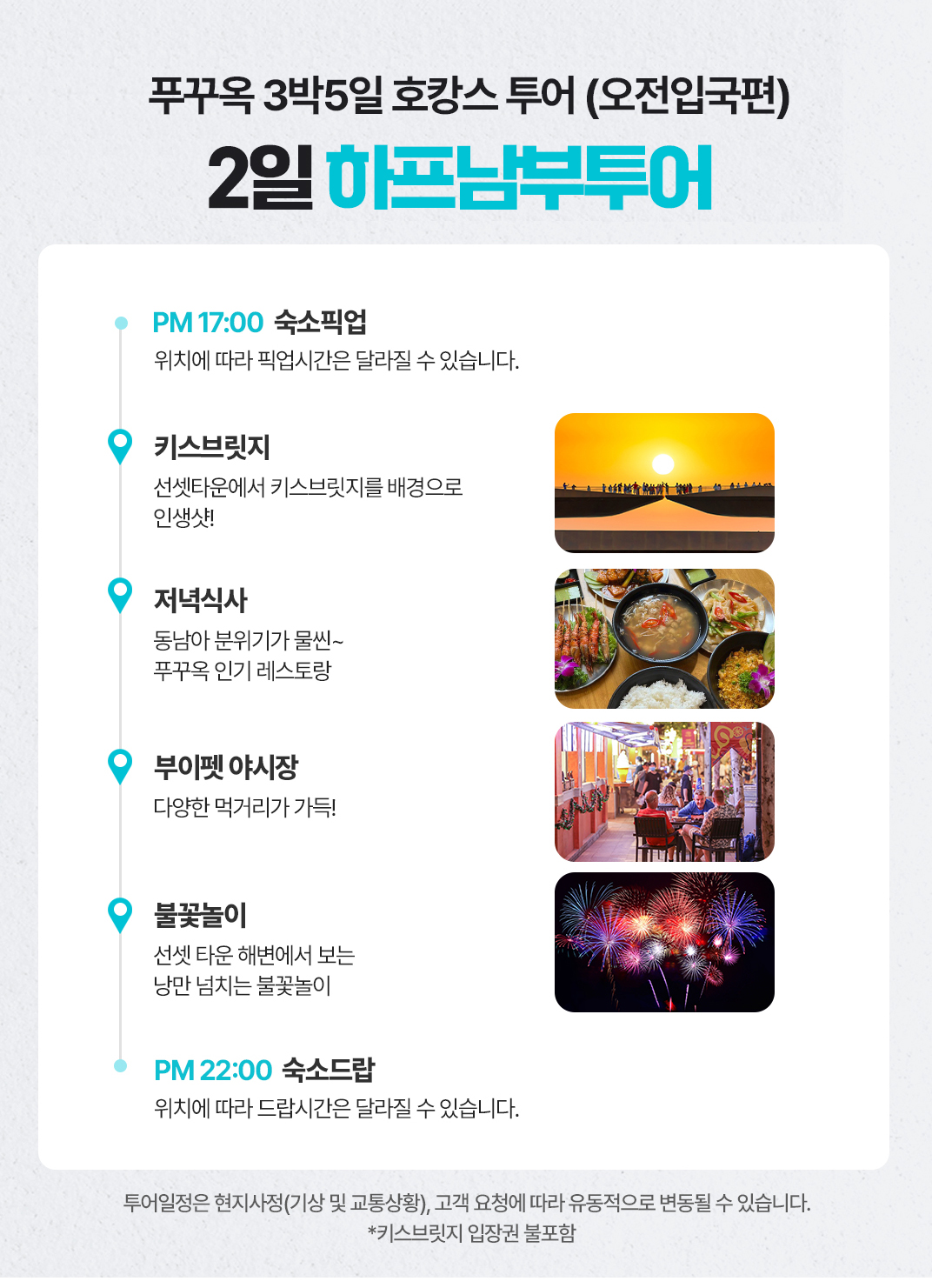 픽업(17:00) → 키스브릿지 → 저녁식사 → 부이펫야시장 → 불꽃놀이 → 숙소드랍(22:00)