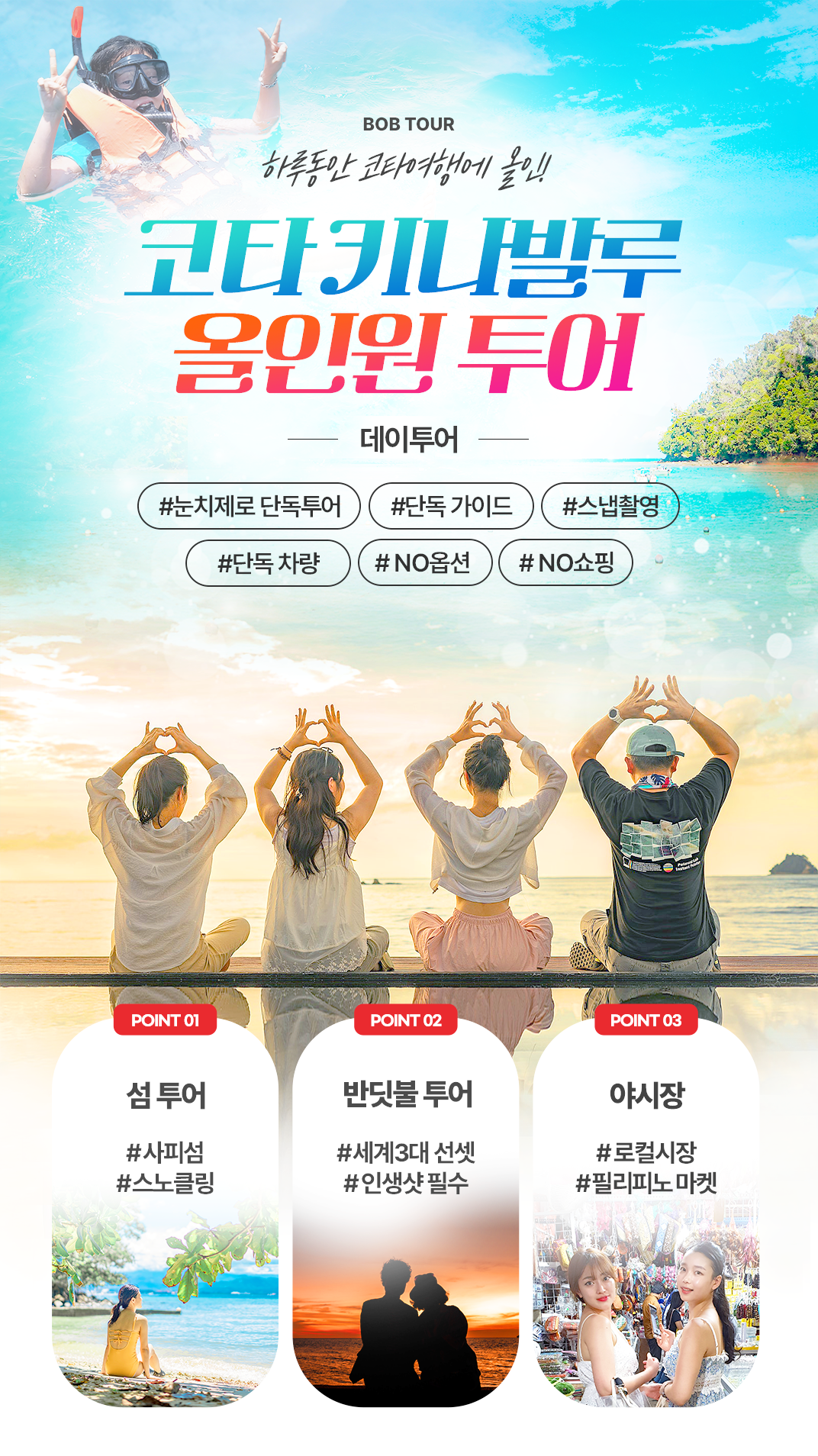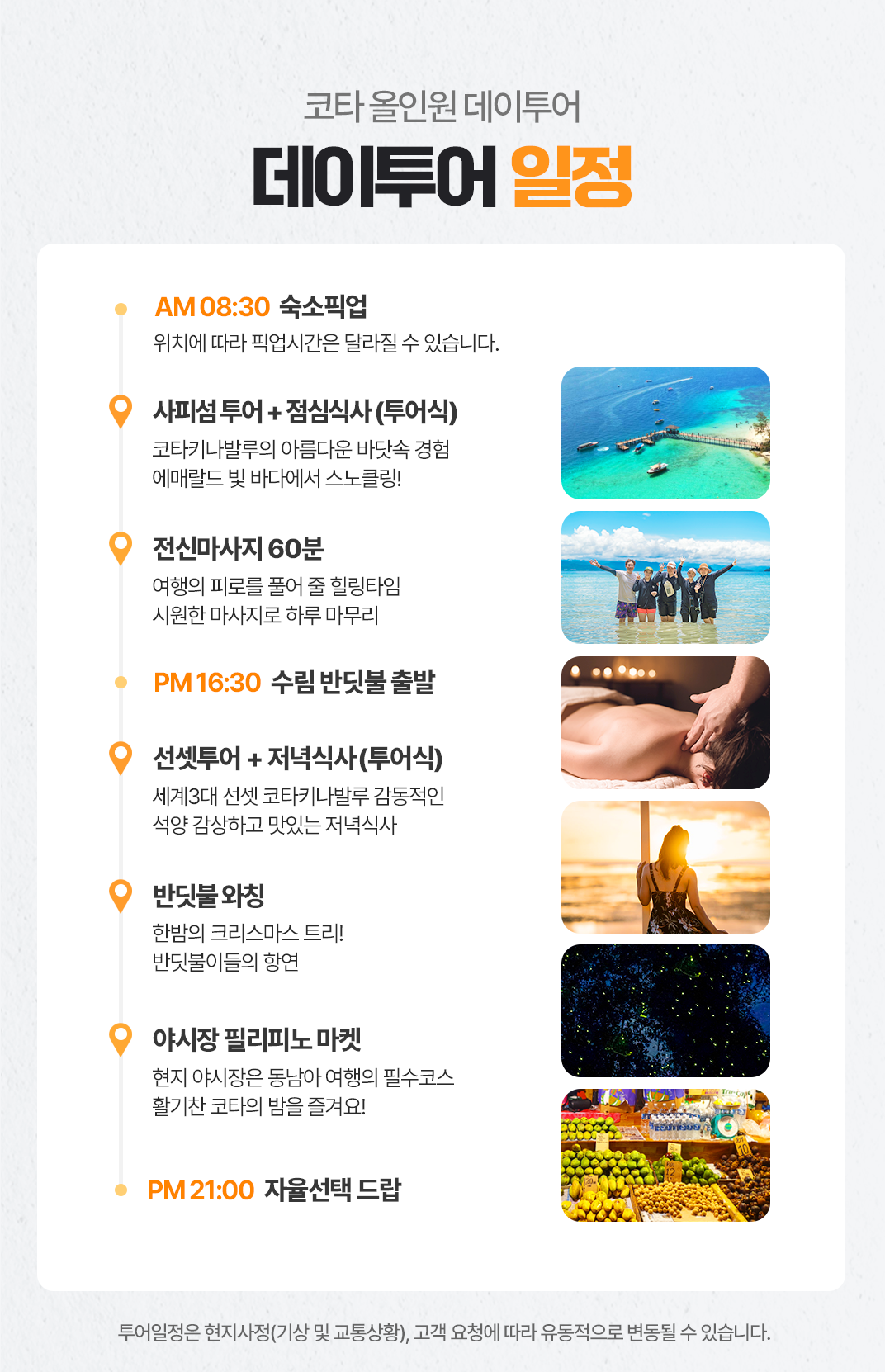 픽업(8:30) → 사피섬투어+점심식사 → 전신마사지 60분 → 수림 반딧불 투어 출발(16:30) → 선셋투어 → 저녁식사 → 반딧불 와칭 → 야시장 필리피노 마켓 → 자율선택 드랍(21:00)