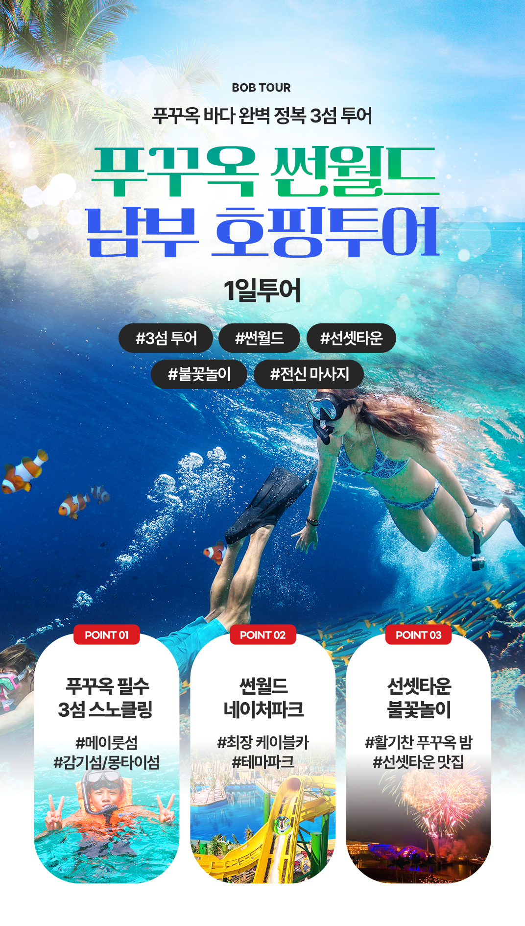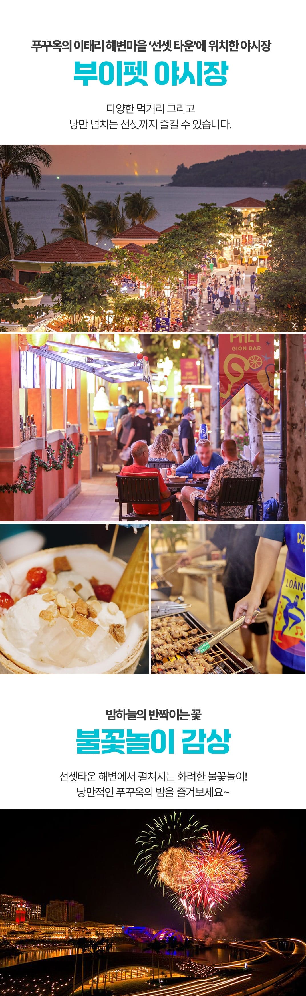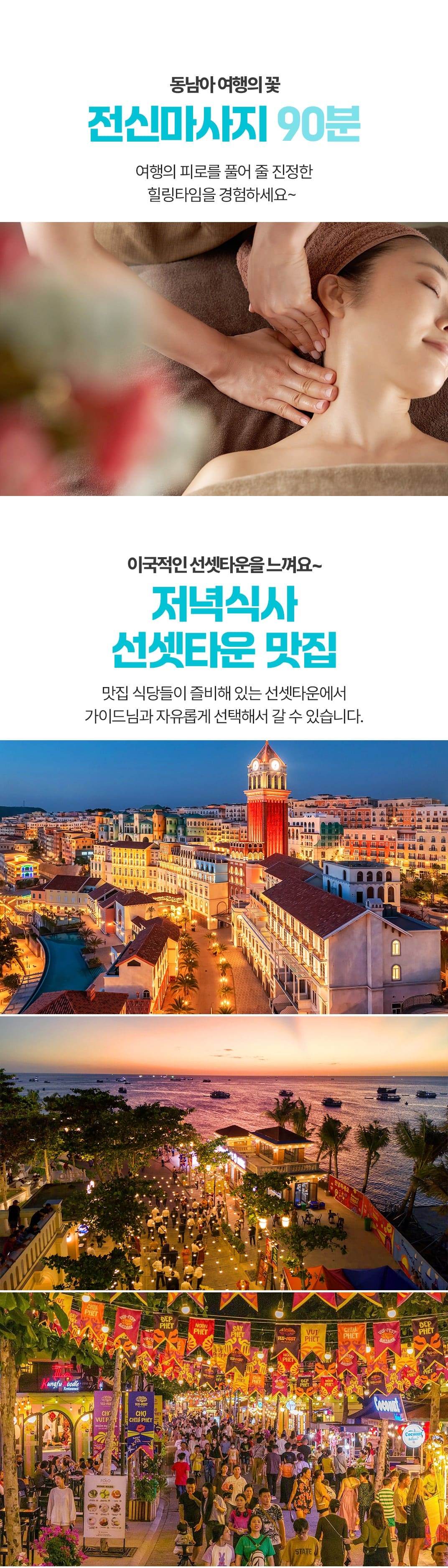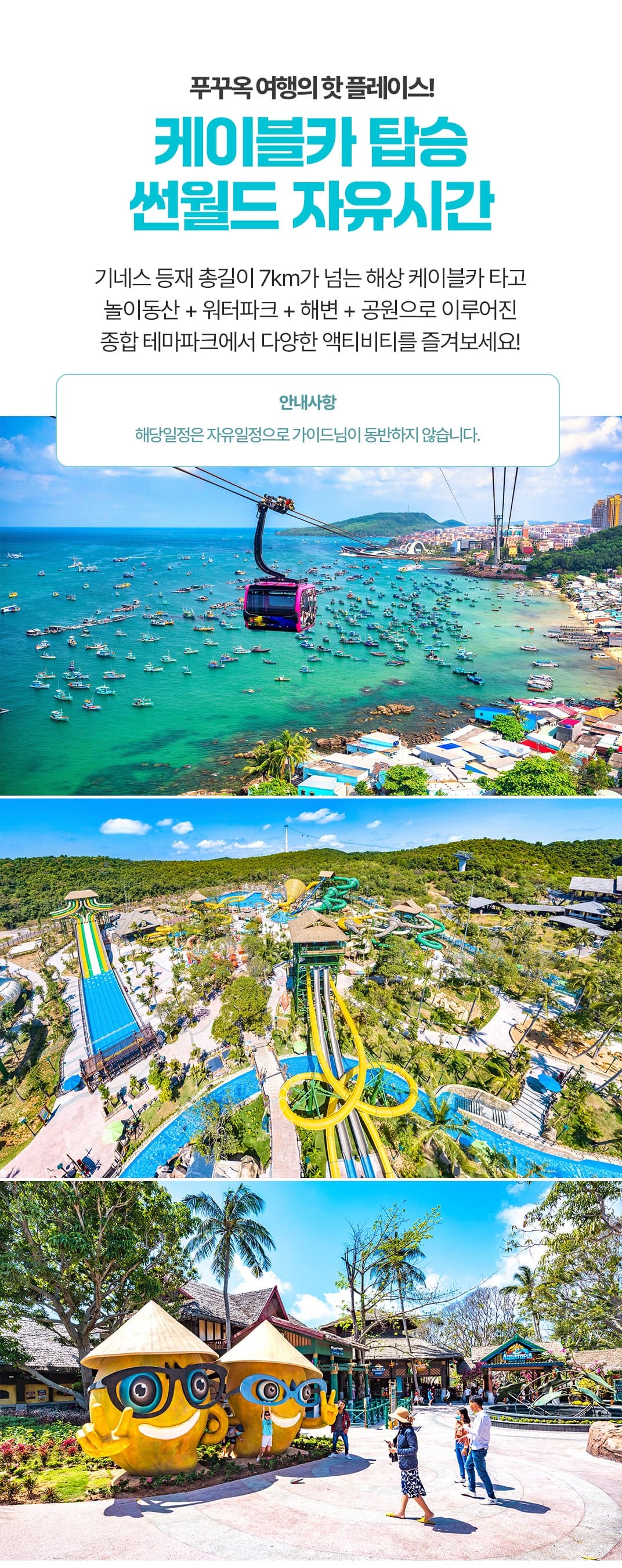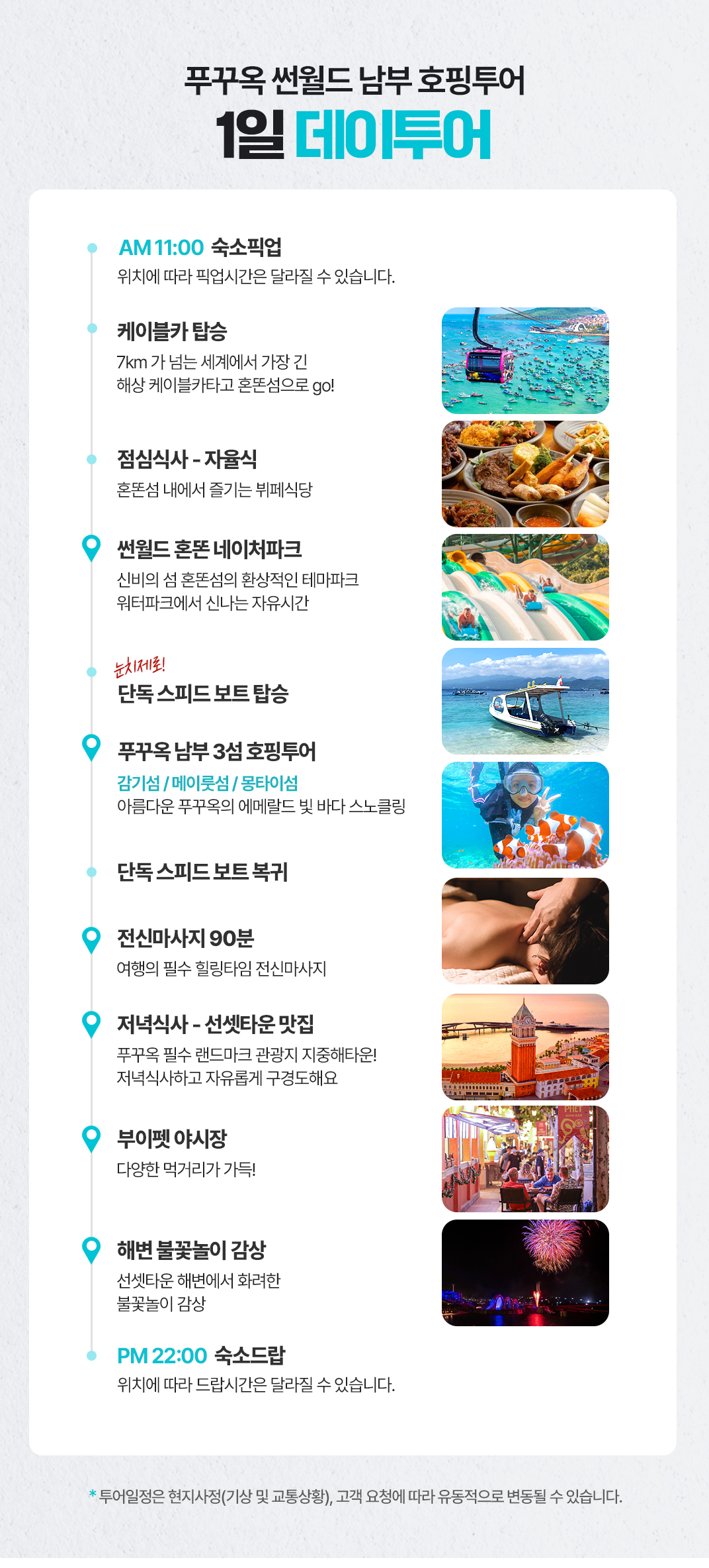 픽업(11:00) → 케이블카 탑승→ 점심식사 → 썬월드 혼똔 네이처 파크 → 단독 스피드보트 탑승 → 푸꾸옥 남부 3섬 호핑투어→ 단독스피드보트 복귀 → 전신마사지 90분 → 저녁식사 - 선셋타운 맛집 → 부이펫 야시장 → 해변 불꽃놀이 감상→ 드랍(22:00)