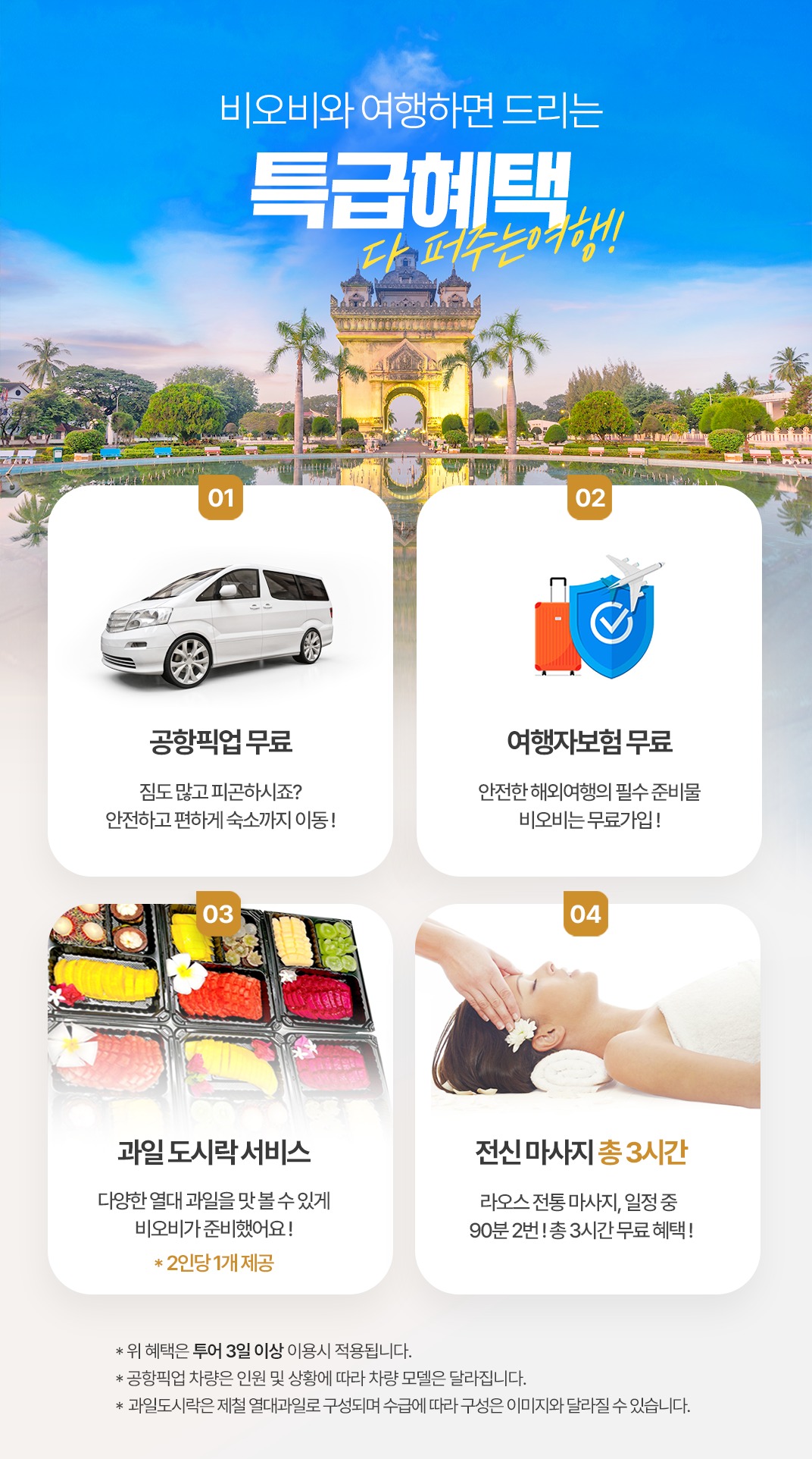 픽업(08:30) → 비엔티안 이동(차량 약 2시간) → 목각 박물관 → 중식 → 왓 시 사켓 / 호 파 케우 사원 → 팍슨몰 → 전신마사지 90분 → 석식 → 탓 루앙 사원(황금사원) → 독립문 빠뚜사이 → 메콩강 야시장 → 공항드랍(21:30)