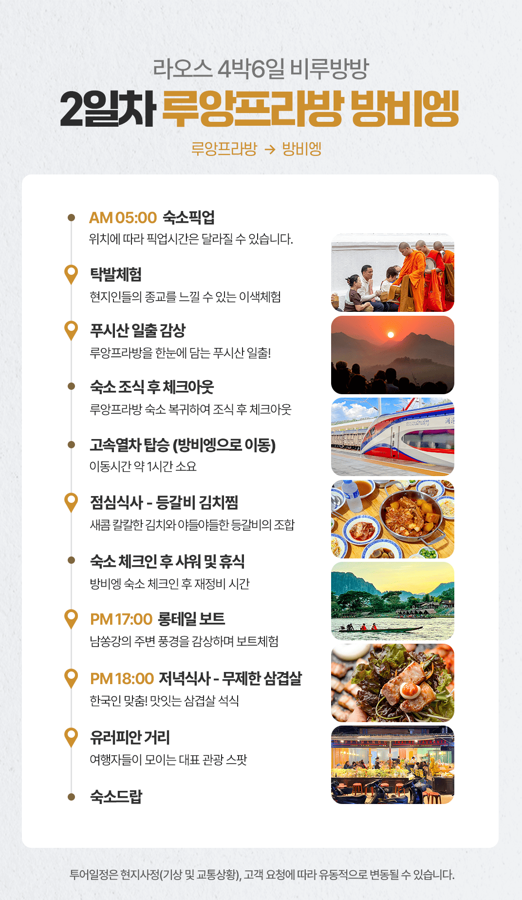 픽업(05:00) → 탁발체험 → 푸시산 일출 감상 → 숙소 조식 후 체크아웃 → 고속열차 탑승(약 1시간) → 중식 → 숙소 체크인 샤워 및 휴식 → 롱테일 보트(17:00) → 석식(18:00) → 유러피안 거리 구경 후 숙소 드랍